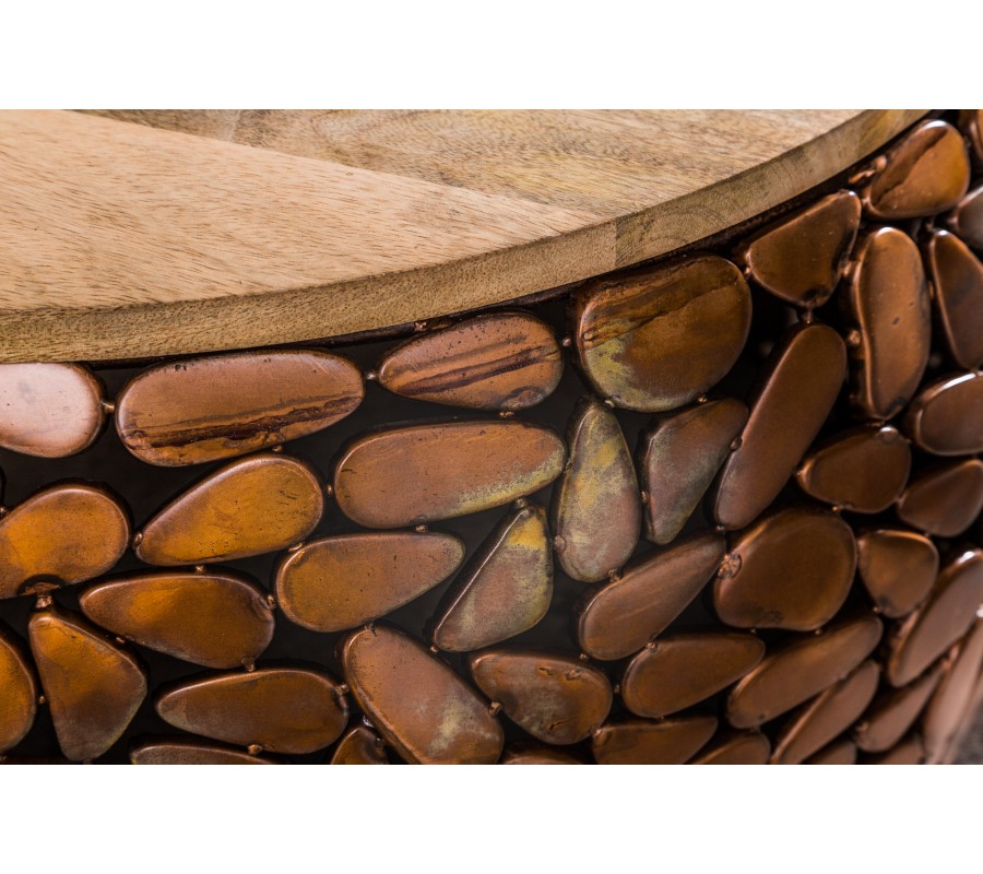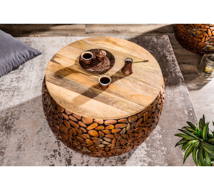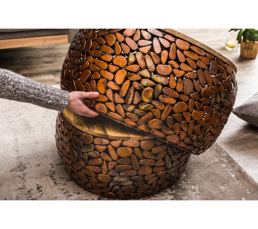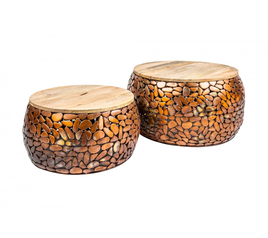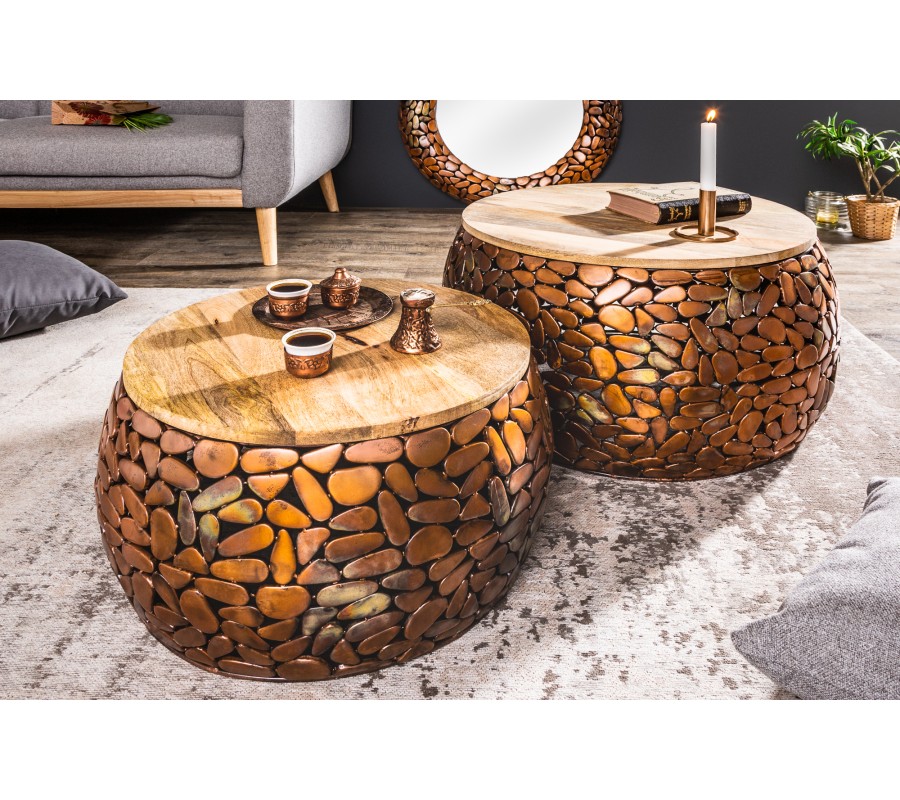 Set dvoch konferenčných stolíkov z kolekcie Riverstone vyniká svojim dizajnom kamennej mozaiky a váš interiér ohreje vďaka teplej medenej farbe. Tieto stolíky majú extravagantný vzhľad vďaka kamennej mozaike s jemnou patinou imitujúcej riečne kamene s 3D efektom. Vrchná doska stolíkov je vyrobená z mahagónového dreva s povrchovou úpravou, ktorá zvýrazňuje štruktúru dreva a zachováva jeho naturálny vzhľad. Stolíky nemajú vo svojom vnútri výplň, čím poskytujú praktický odkladací priestor. Stolíky sú je vhodné do dizajnových interiérov a hodia sa do vašej obývacej izby v teplých farbách ale dodajú reprezentatívneho ducha aj vo vašej kancelárii. Stolíky sú vyrobené ručne a každý kúsok je preto unikátnym nábytkom. Menší stolík má rozmery priemer 53cm a výšku 28cm.