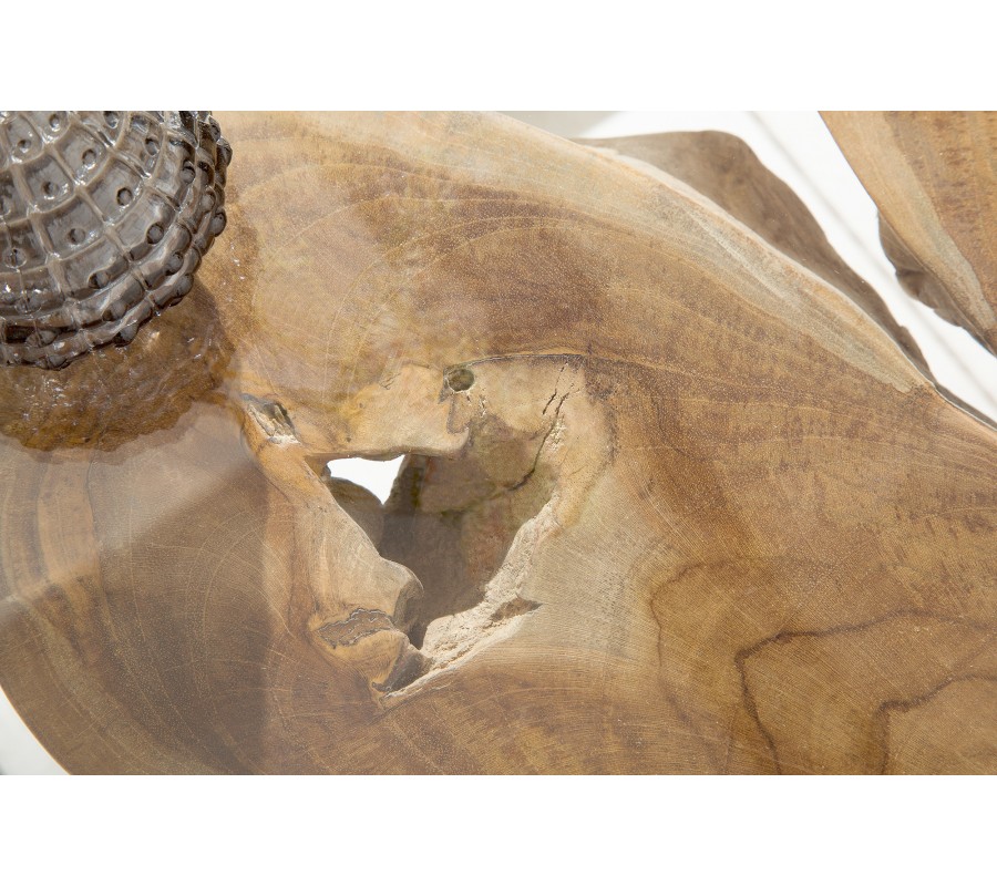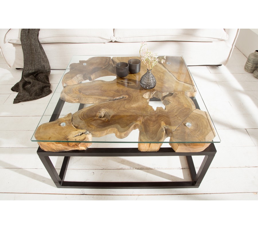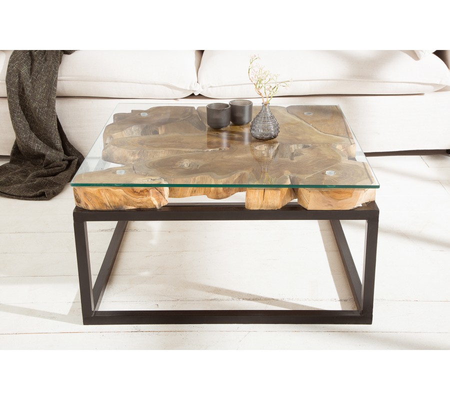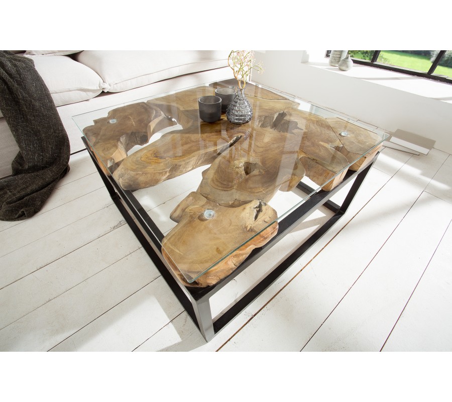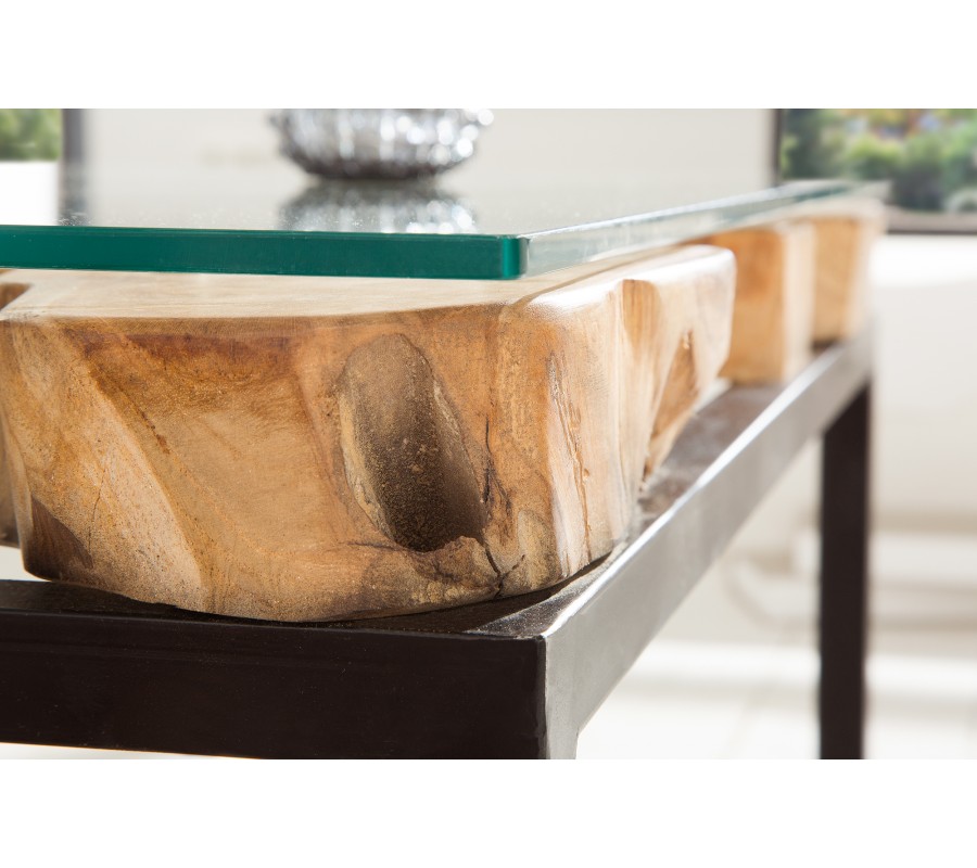 Industriálny konferenčný stolík Teak Root z masívu zaujme svojim hlavným motívom vytváraným opracovaným drevom z kmeňa teakového stromu. Industriálny štýl je zvýraznený využitím kovového rámu spolu so sklenenou platnou z temperovaného skla na jeho povrchu. Kovový rám dodáva stolíku potrebnú stabilitu a zabezpečuje aj jeho trvácnosť. Použitím ručne spracovaného teakového dreva rôznej štruktúry je každý kus jedinečným a neopakovateľným.