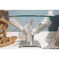 Konferenčný stolík Helice kombinuje netradičný dizajn s výraznými materiálmi. Základ tvorí kovová noha v tvare lodnej vrtule a vrchná doska je z číreho, tvrdého, pevného, odolného, bezpečnostného skla s hladkým povrchom. Kovová noha má surový, brúsený povrch v striebornom odtieni, ktorý pôsobí industriálnym dojmom. Široké lopatky vrtule vyžarujú dynamiku a originalitu, zatiaľ čo pevná štvorcová podstava poskytuje stabilitu a dopĺňa robustný vzhľad.