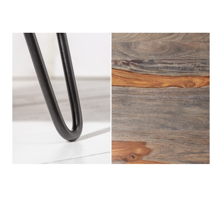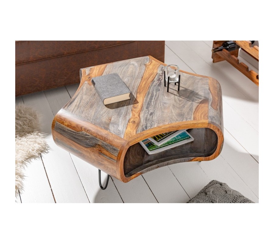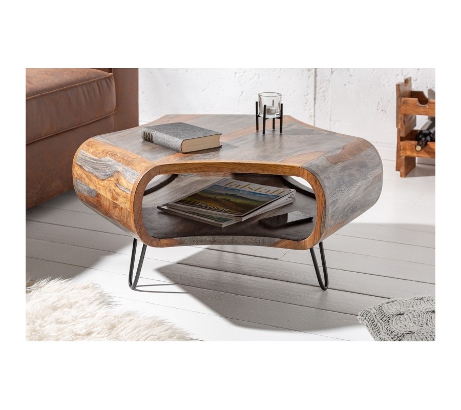 Dizajnový konferenčný stolík Spin je skutočne originálnym a nevšedným kúskom, ktorý zaujme každého milovníka masívneho dreva či retro štýlu. Ide o stolík nevšedného tvaru, ktorý disponuje odkladacím priestorom v podobe poličky na drobnejšie predmety, časopisy alebo knihy. Je vyrobený z kvalitného masívneho dreva sheesham, na ktorom môžeme vidieť jeho zaujímavú kresbu. Prírodná hnedá farba dreva v kombinácii so sivou krásne vynikne v svetlejších interiéroch a vašu obývačku zaručene rozžiari. Drevo je doplnené o nohy z kovu v čiernej farbe, ktoré s hnedou a sivou príjemne kontrastujú a dopĺňajú celý dizajn.