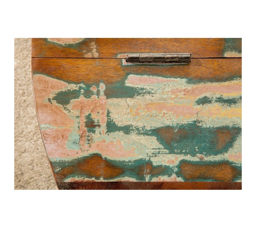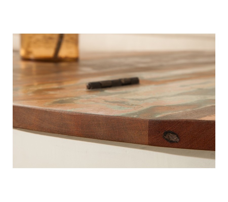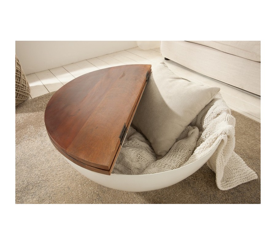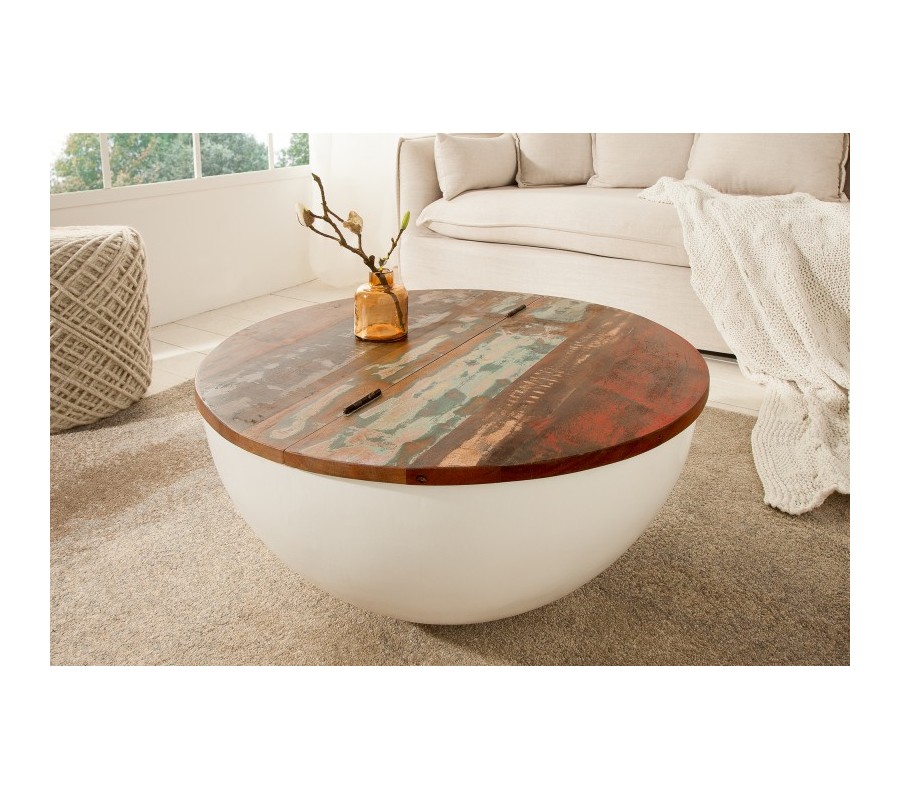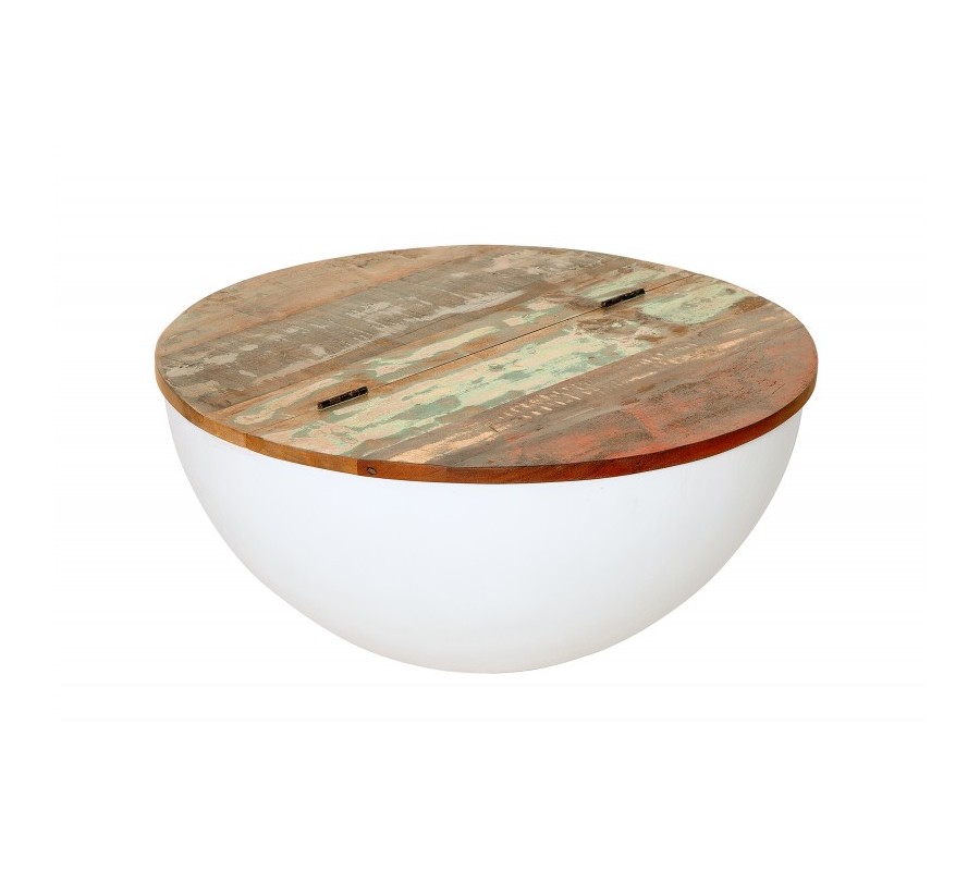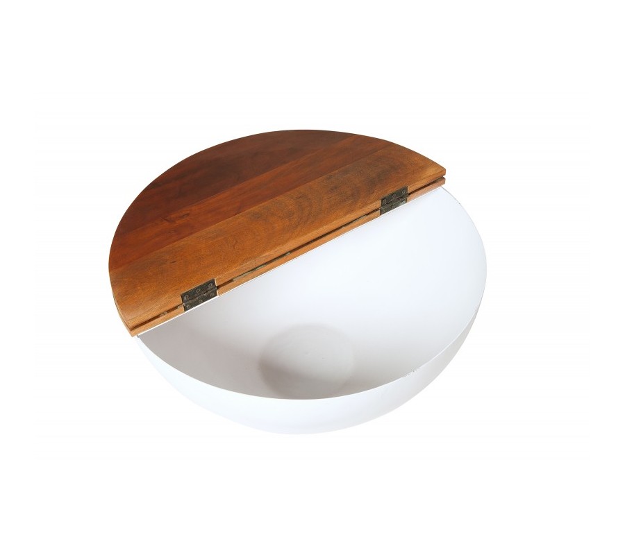 Jedinečný konferenčný stolík Sevii je zaujímavý najmä vďaka svojmu špecifickému pologuľovitému tvaru a povrchovej dosky z recyklovaného dreva. Vďaka kombinácii drevenej dosky a tela z bieleho kovu nadobúda špecifický a originálny vzhľad, ktorý môže zdobiť aj vašu obývačku. Stolík Sevii je ručne spracovaný, a tak každý kúsok je jedinečný a môžu sa tu nachádzať drobné farebné či tvarové odchýlky. Doska sa dá odklopiť a vnútro stola tak môže slúžiť ako úložný priestor na rôzne predmety, ako napríklad deky či vankúše. Svojou farebnosťou aj dizajnom skvelo vynikne v moderných svetlých priestoroch.