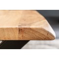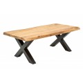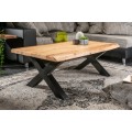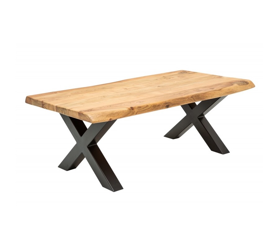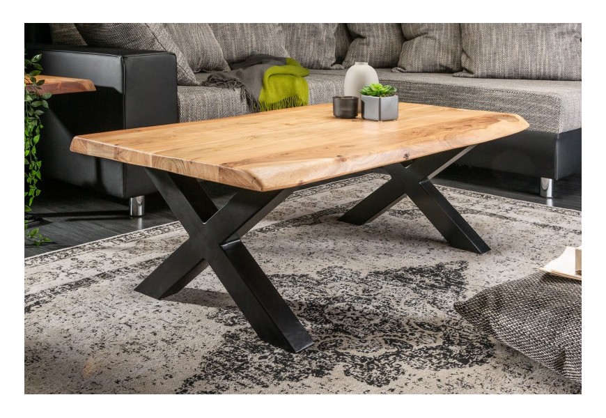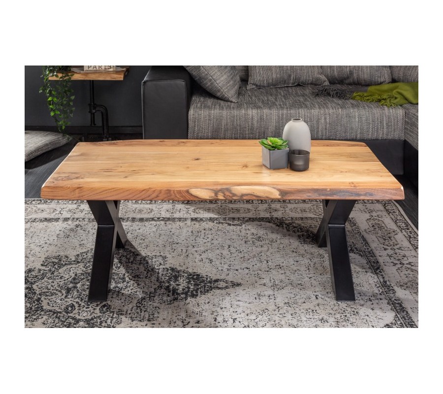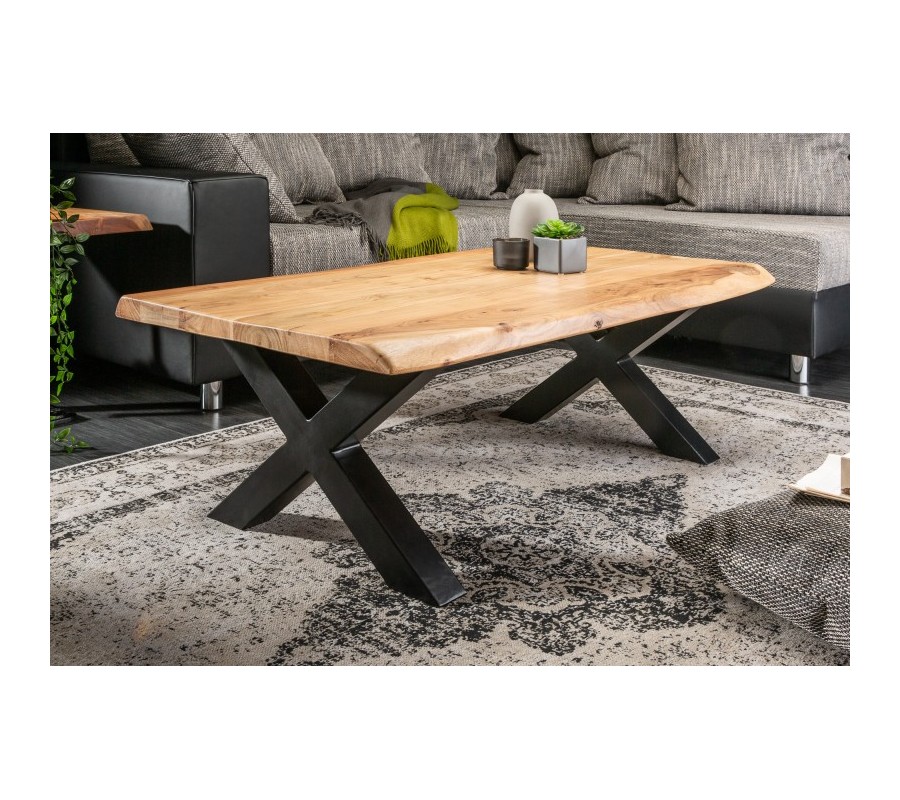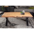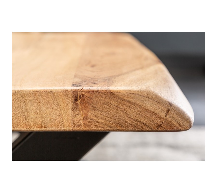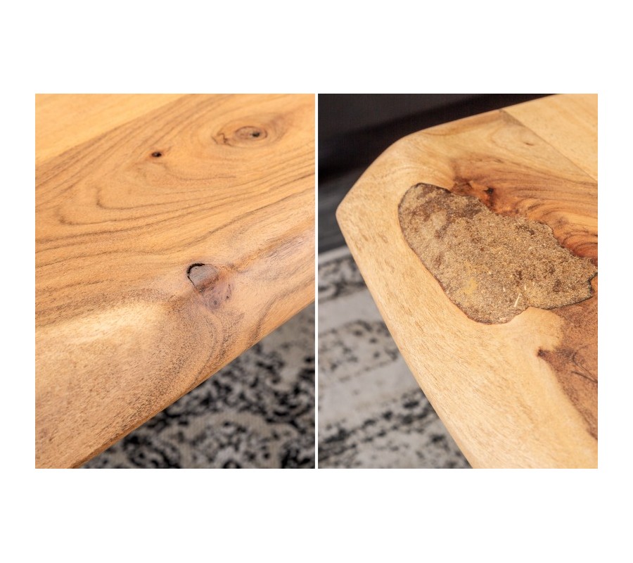 Štýlový masívny konferenčný stolík Mammut je vyrobený z prírodného masívneho agátového dreva. Vrchná doska nepravidelného tvaru so zachovalou štruktúrou dreva tohto príručného stolíka dodáva impozantný, originálny vzhľad. Spodok tvoria kovové nohy, ktoré zabezpečujú celkovú stabilitu stola. Kovové nohy stolíka v tvare X pripomínajú industriálny štýl. Keďže sa jedná o prírodný masív, každý produkt je jedinečný a môže sa líšiť. Tento jedinečný kúsok nábytku zapadne do prírodne, moderne zariadenej obývačky. Vhodnou kombináciou sú svetlé farby a vďaka jeho veľkosti sa zmestí do každého priestoru. Jedná sa o ručnú výrobu, preto je každý stolík unikátny. Ak máte v pláne si zariadiť interiér Vašich snov, neváhajte siahnuť po tomto kúsku.