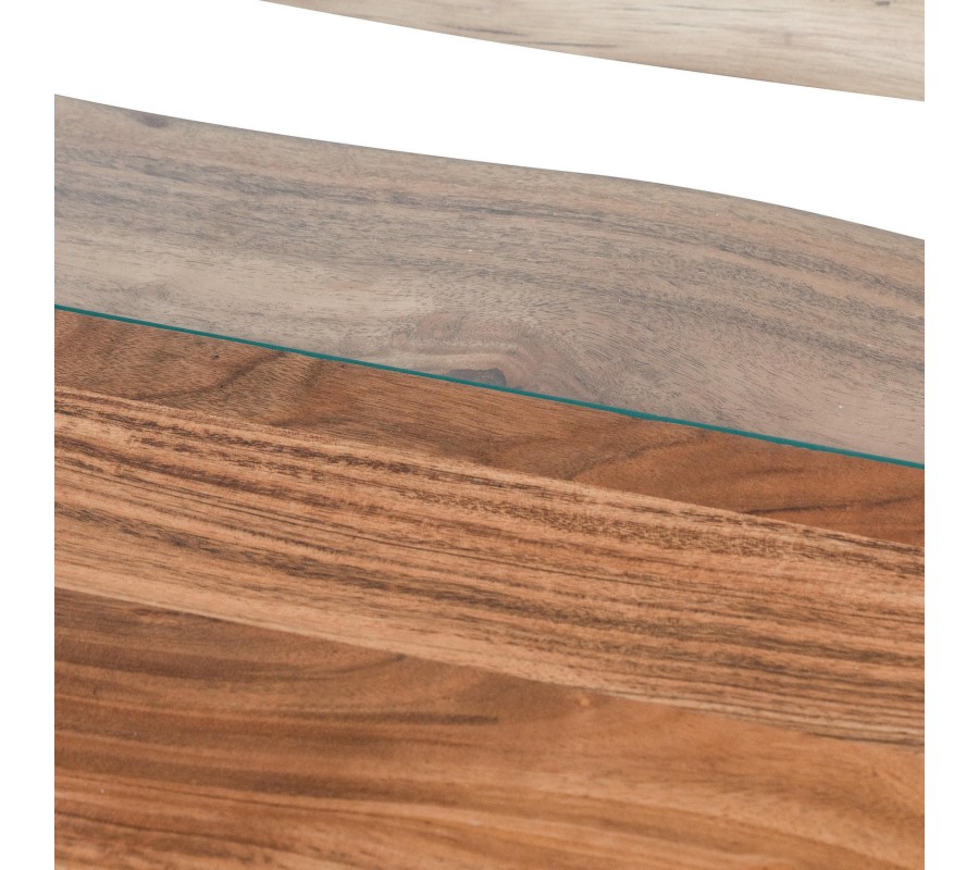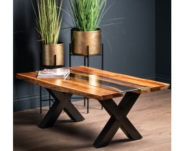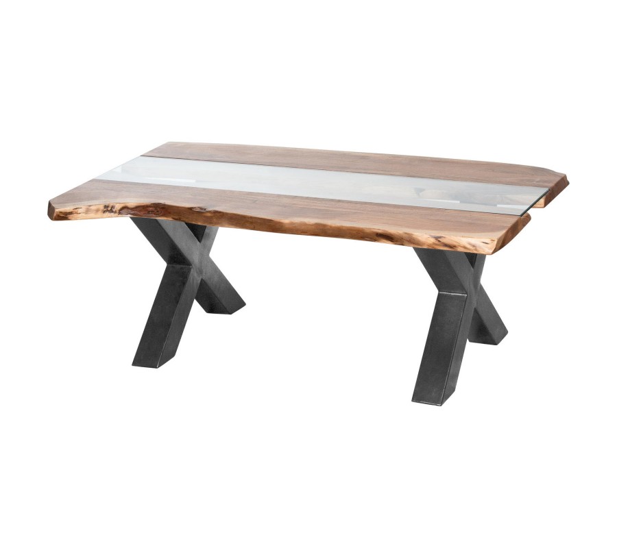 Industriálny konferenčný stolík Live Edge v tvare obdĺžnika na prekrížených nožičkách s hnedou akáciovou doskou a sklom 115cm