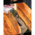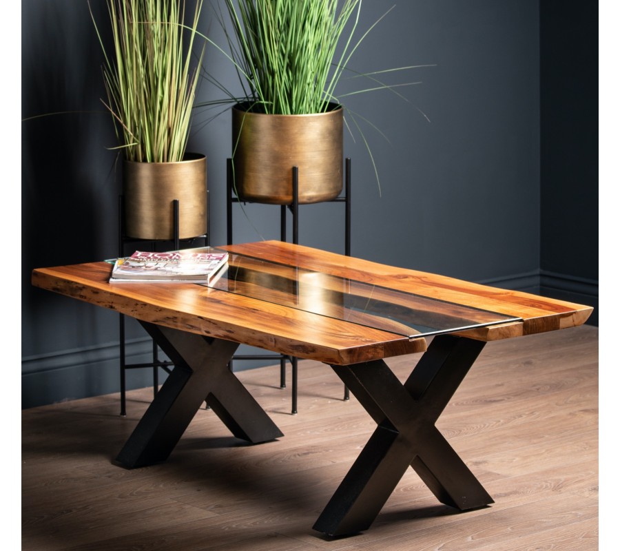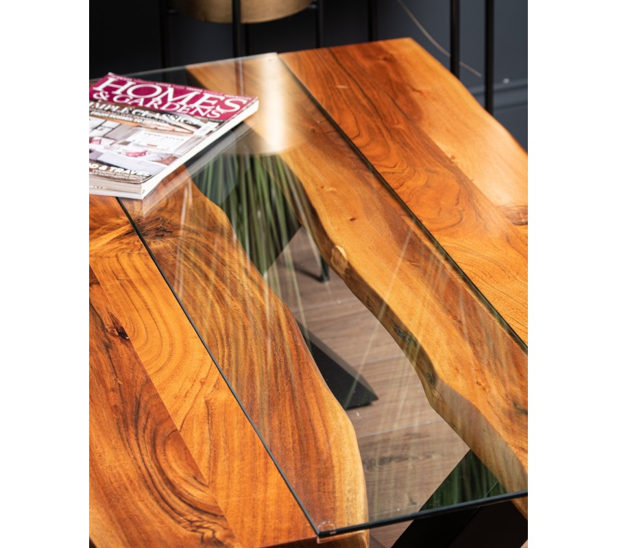 Kvalitné vyhotovenie masívneho konferenčného stola z kolekcie Live Edge zaručuje stabilitu a pevnosť konštrukcie. Celokovové nohy v čiernej matnej farbe sú dizajnovo prekrížené a štýlovo dopĺňajú masívnu vrchnú dosku obdĺžnikového tvaru. Hnedá akáciová doska je uprosted ozvláštnená sklenenou aplikáciou, ktorá pripomína tok rieky. Stolík disponuje kompaktnými rozmermi, pôsobí zaujímavým a živým dojmom vďaka riečnej aplikácii v kombinácii s matnou čiernou. Krásna prirodzená kresba dreva dotvára celkový industriálny nádych a predurčuje stôl ako ideálnu voľbu pre milovníkov praktického a zároveň štýlového nábytku. V kombinácii s industriálne ladenými kreslami či regálmi na čiernych nožičkách vytvorí dokonalú atmosféru. Rovnako sa bude hodiť k industriálnym doplnkom v podobe zmenšeniny šijacieho stroja či závesných hodín s viditeľným mechanizmom. Akáciový konferenčný masívny stolík Live Edge sa stane obľúbeným kúskom aj vo vašej domácnosti, pretože poskytuje kvalitu, špičkový dizajn a kompaktné rozmery aj pre tých, čo bojujú s malým priestorom v obývačke.