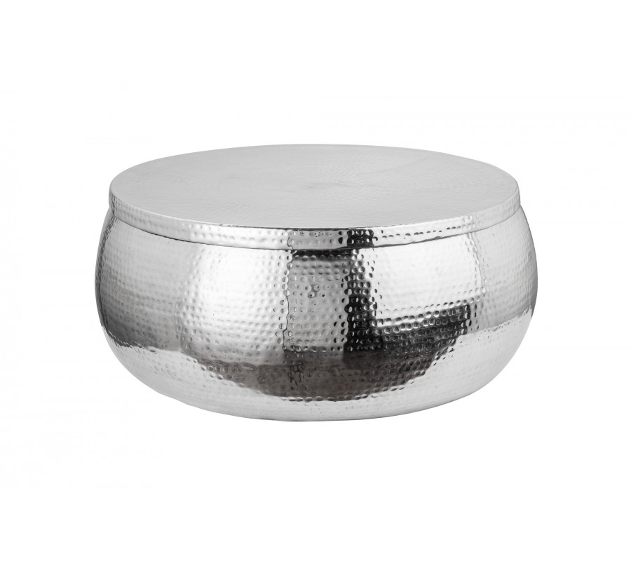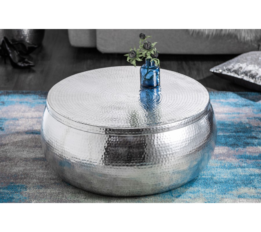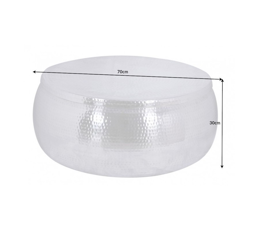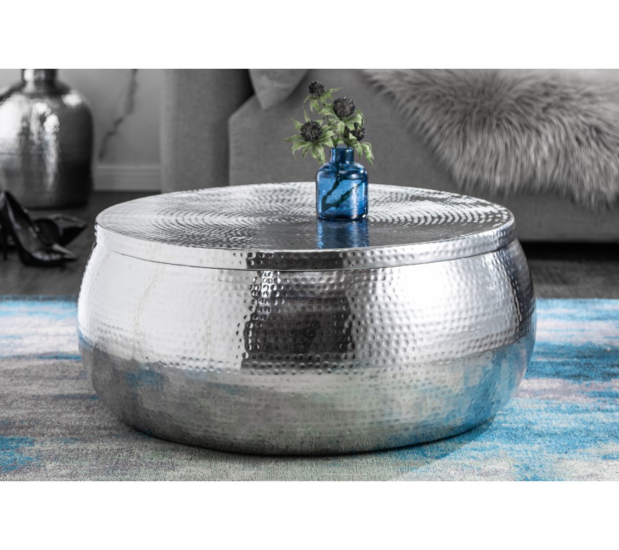 Orientálny kruhový konferenčný stolík Hammerblow s úložným priestorom v striebornom prevedení 70cm