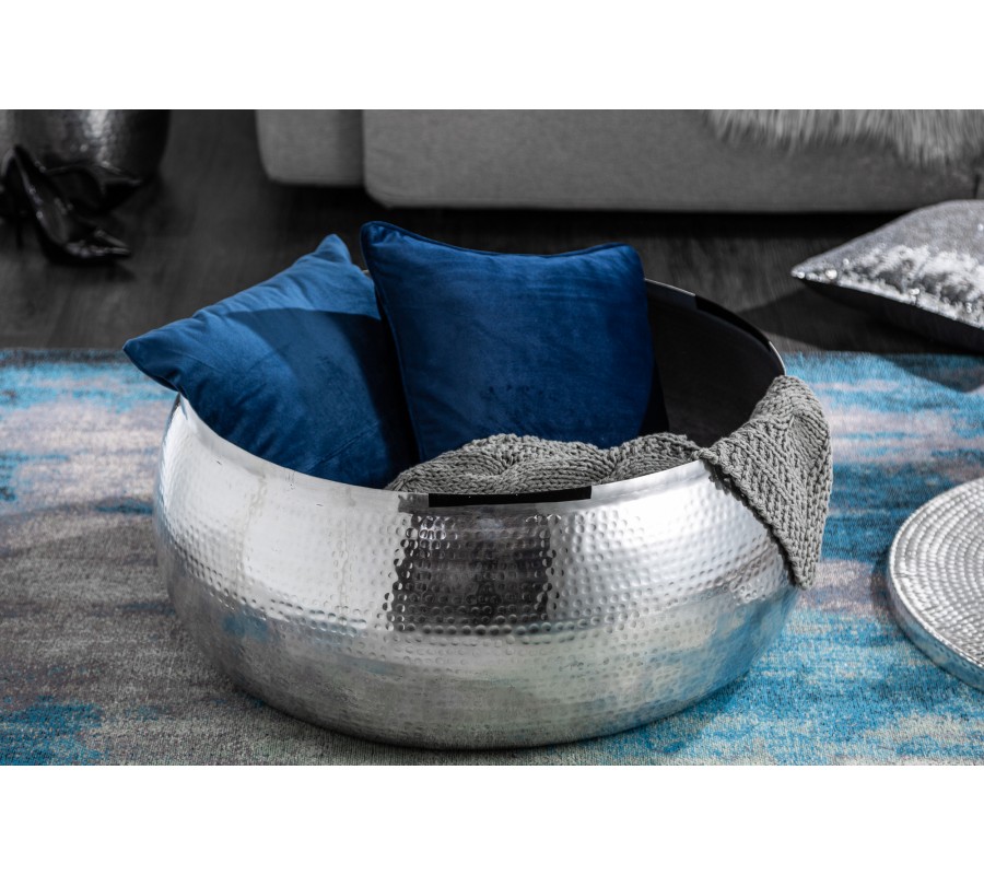 Štýlový konferenčný stolík Hammerblow je jedinečným kúskom, ktorý sa vo vašej obývačke zaručene stane dominantou. Stolík je vyrobený z kovu a jeho kruhový tvar prispieva k špecifickému orientálne pôsobiacemu dizajnu. Povrch je zaujímavý vďaka jamkovému reliéfu, ktorý vytvára špecifický dizajn. Povrch, ktorý je výsledkom ručnej výroby robí každý kus zo série konferenčných stolíkov Siliguri jedinečným. Nesie sa v štýlovej striebornej farbe, vďaka ktorej skvelo zapadne aj do Art-deco či orientálne ladených interiérov. Pod kruhovou odkladacou plochou sa nachádza praktický úložný priestor na vaše obľúbené textilné prikrývky či sedacie vankúše pre návštevy. Vynikne v dizajnových, svetlejšie i tmavšie ladených priestoroch v kombinácii s kovovými doplnkami či dekoráciami vo výraznejších farbách ako je modrá či zelená.