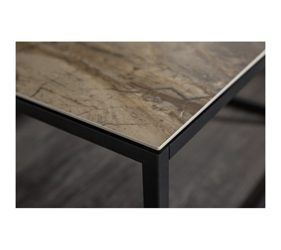 Jedinečný konferenčný stolík Collabor predstavuje elegantné prepojenie industriálneho a moderného štýlu. Je zaujímavý najmä vďaka mramorovému efektu keramickej povrchovej dosky s bezpečnostným sklom, ktorá sa nesie v sivých a hnedých odtieňoch. Kovový rám čiernej farbe dopĺňa a umocňuje celkový industriálny vzhľad a s doskou vytvára jedinečnú kombináciu, ktorá vynikne v akokoľvek farebne ladenom priestore. Tento štýlový dizajn sa hodí nielen do moderne či industriálne ladených obývačiek, ale dá sa krásne doladiť aj art-deco doplnkami, čalúnenými stoličkami či inými výraznejšími dekoráciami.