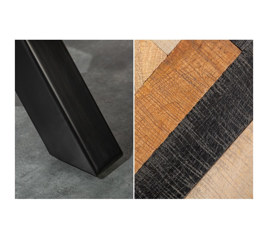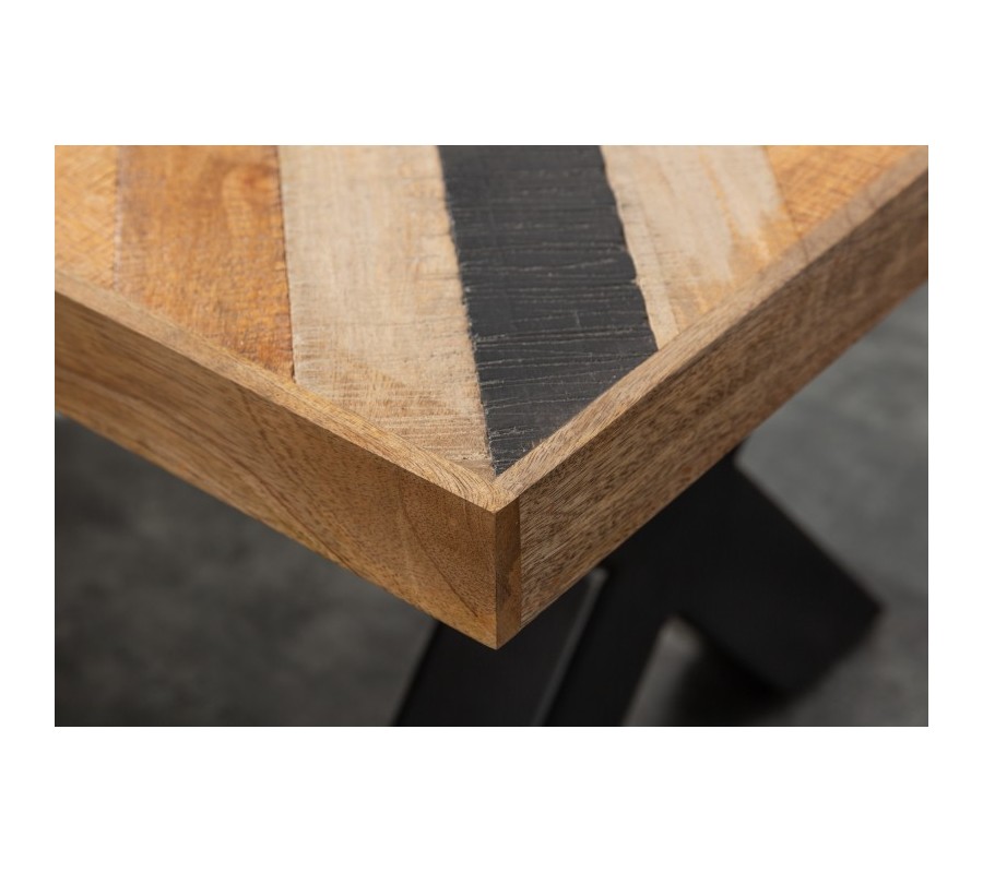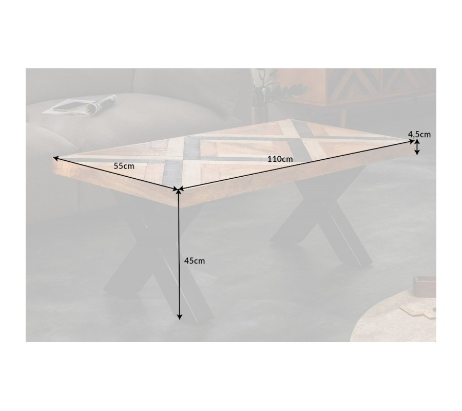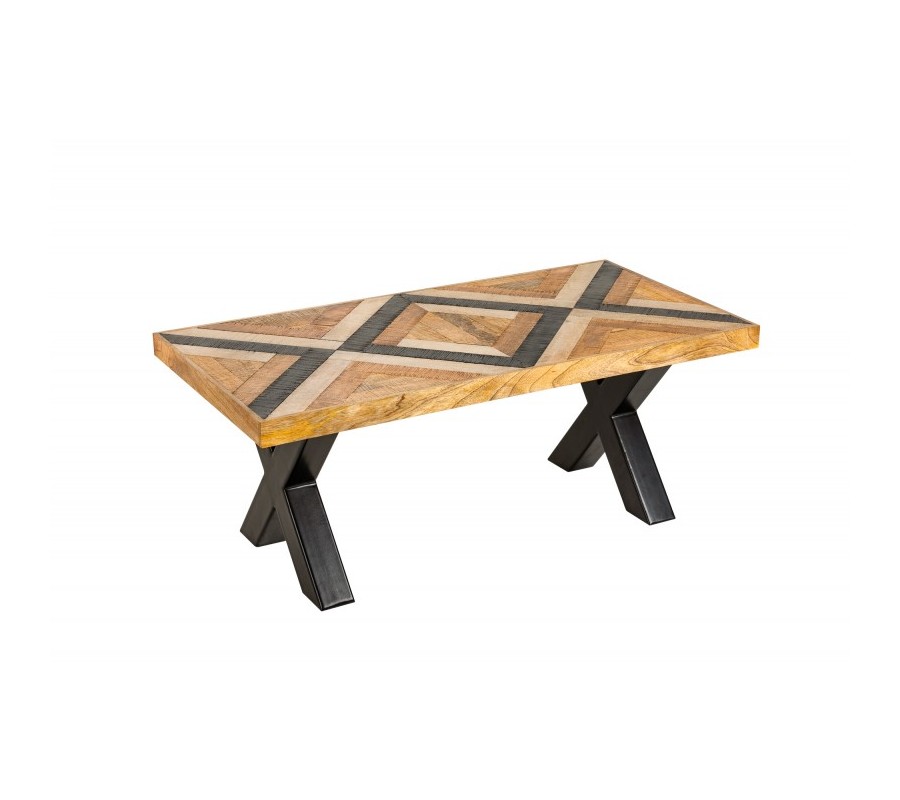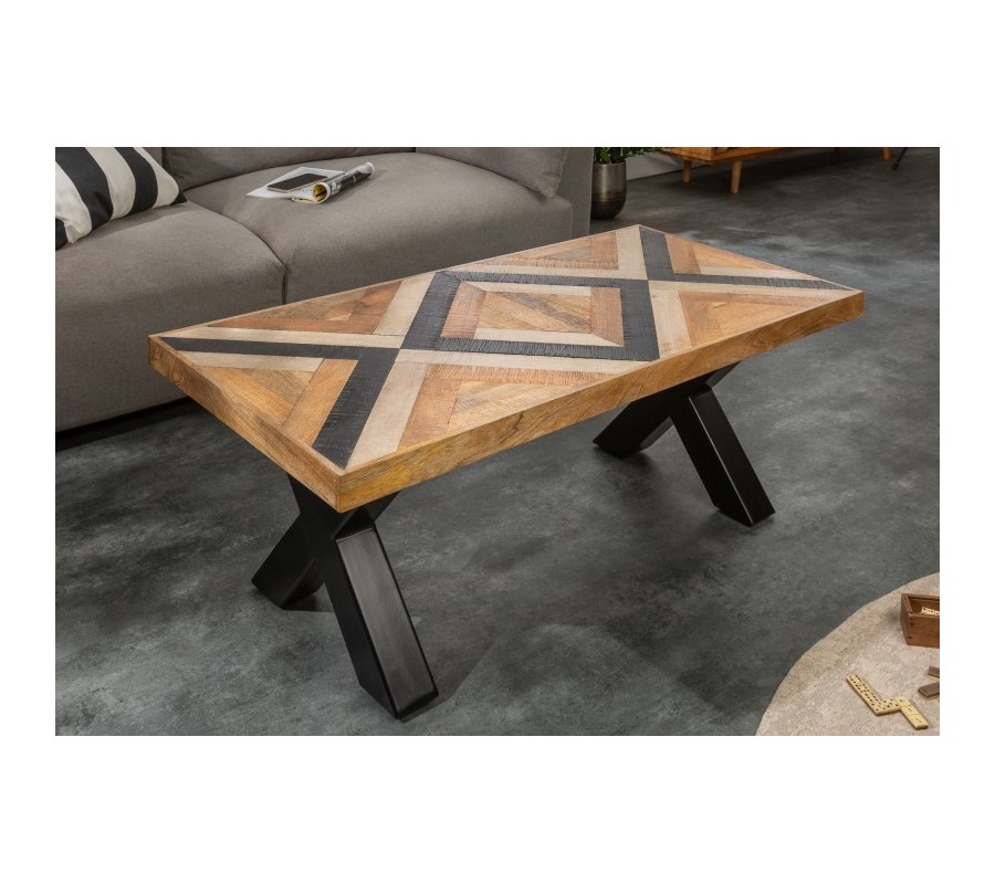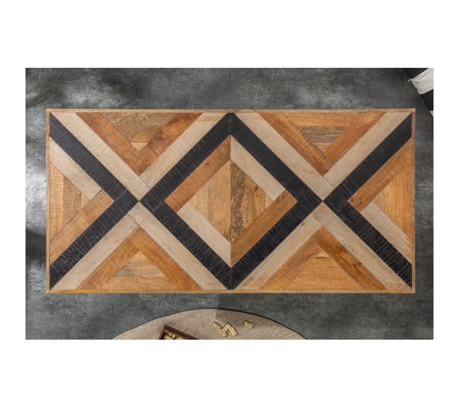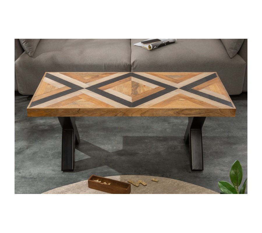 Štýlový konferenčný stolík z našej jedinečnej kolekcie nábytku Frida Blanca je zaujímavým kúskom, ktorý vynikne predovšetkým vďaka svojmu ornamentálnemu zdobeniu. Jeho špecifický dizajn je tvorený viacerými odtieňmi dreva usporiadanými do tvarov písmena x. Stolík je vyrobený z masívneho mangového dreva, ktoré je doplnené o mohutné čierne kovové nohy. Krásne zapadne do vidiecky alebo industriálne ladených priestorov.