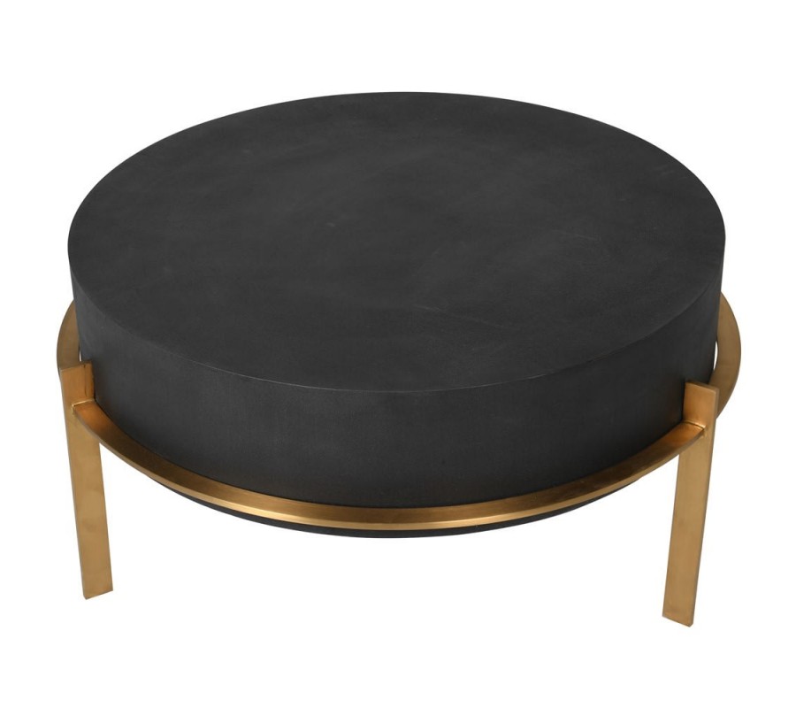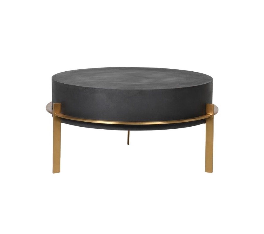 Moderný okrúhly konferenčný stolík z odolného betónu v čiernej farbe s nožičkami v zlatej matnej farbe z brúsenej ocele zaručene upúta zrak nejedného návštevníka Vašej domácnosti. Horná okrúhla doska stolíka z kameňa-betónu zafarbená na čierno je uchytená v stabilnom oceľovom ráme v zlatej farbe s tromi nožičkami, ktorý elegantne obopína tmavú hornú dosku. Kombinácia tmavej čiernej farby so zlatou farbou nožičiek a rámu dodáva stolíku luxusný vzhľad. Stolík sa hodí do kaviarní či barov v kontrastných tmavých zlatých farbách zariadených v štýle Art-deco a nestratí sa ani v interiéri zariadenom v pompéznom Glamour štýle.
