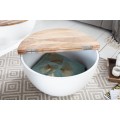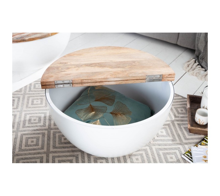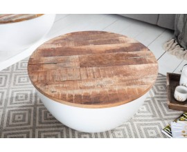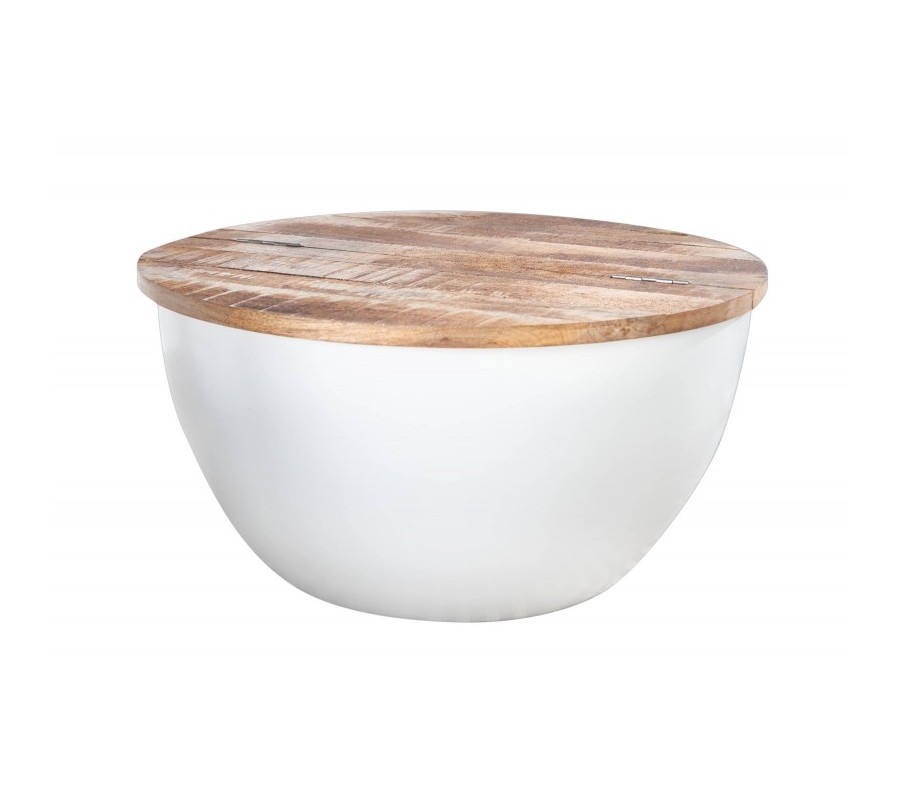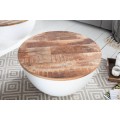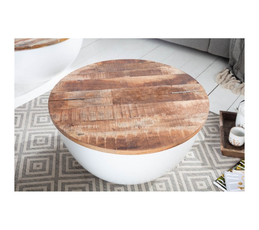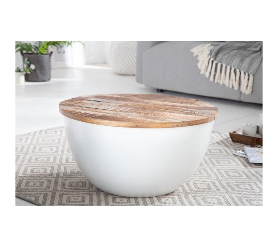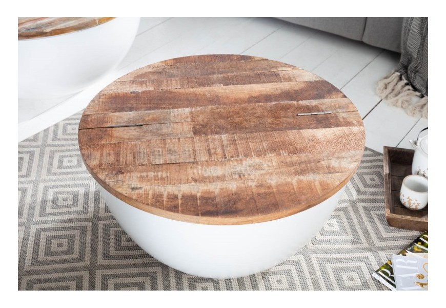 Štýlový konferenčný stolík Sevii vás na prvý pohľad zaujme nevšednou kruhovou podstavou. Podstava je vyrobená z kovu v bielej farbe a tvorí harmonickú kombináciu s prírodnou povrchovou doskou z mangového masívu. Vrchná kruhová doska je povrchovo upravená tak, že na nej zámerne vystupuje prírodná štruktúra dreva a jej skladba z viacerých dosiek. Vďaka jednoduchému systému je možné dosku čiastočne odklopiť a úložný priestor využiť napríklad na uskladnenie deky, vankúšov či časopisov. Vďaka nadčasovému a minimalistickému, čistému dizajnu je stolík Sevii výborne kombinovateľný a poľahky zapadne do moderných či industriálne ladených interiérov. Vynikne predovšetkým v svetlo zariadených obývačkách v kombinácii s masívnym nábytkom či pohodlnou čalúnenou sedačkou a doplnkami z kovu.