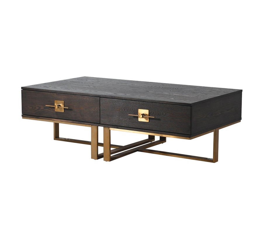 Štýlový konferenčný stolík Luxuria je jedinečný svojím nadčasovým moderným vzhľadom. Je to kúsok ideálny najmä do priestranných obývačiek ladených v industriálnom alebo art-deco štýle. Povrchová doska z kombinácie MDF a jaseňovej dyhy v tmavohnedej farbe je doplnená o geometrickú zlatú kovovú konštrukciu, ktorá dodáva stolu art-deco nádych. Stolík disponuje dvomi praktickými zásuvkami so zlatými kovovými rukoväťami. Celkový dizajn dotvára tiež povrchová úprava dreva, ktorá necháva vyniknúť jeho prirodzenú kresbu a do vašich priestorov vnesie naturálny nádych. Konferenčný stolík Luxuria odporúčame kombinovať s ďalším tmavým dreveným nábytkom či doplnkami z kovu v zlatej farbe.