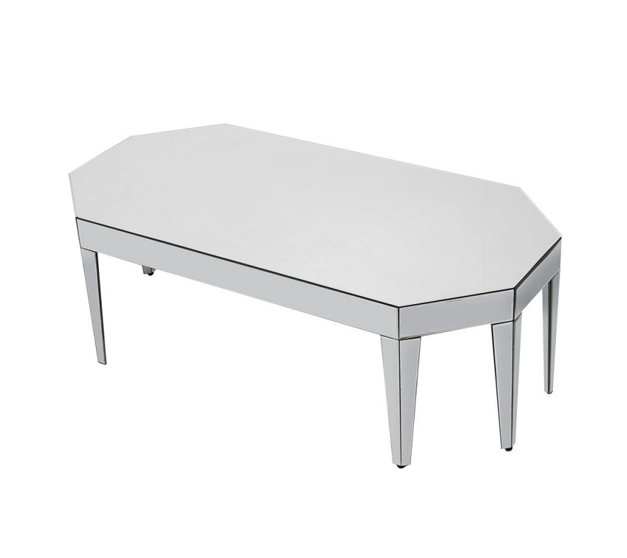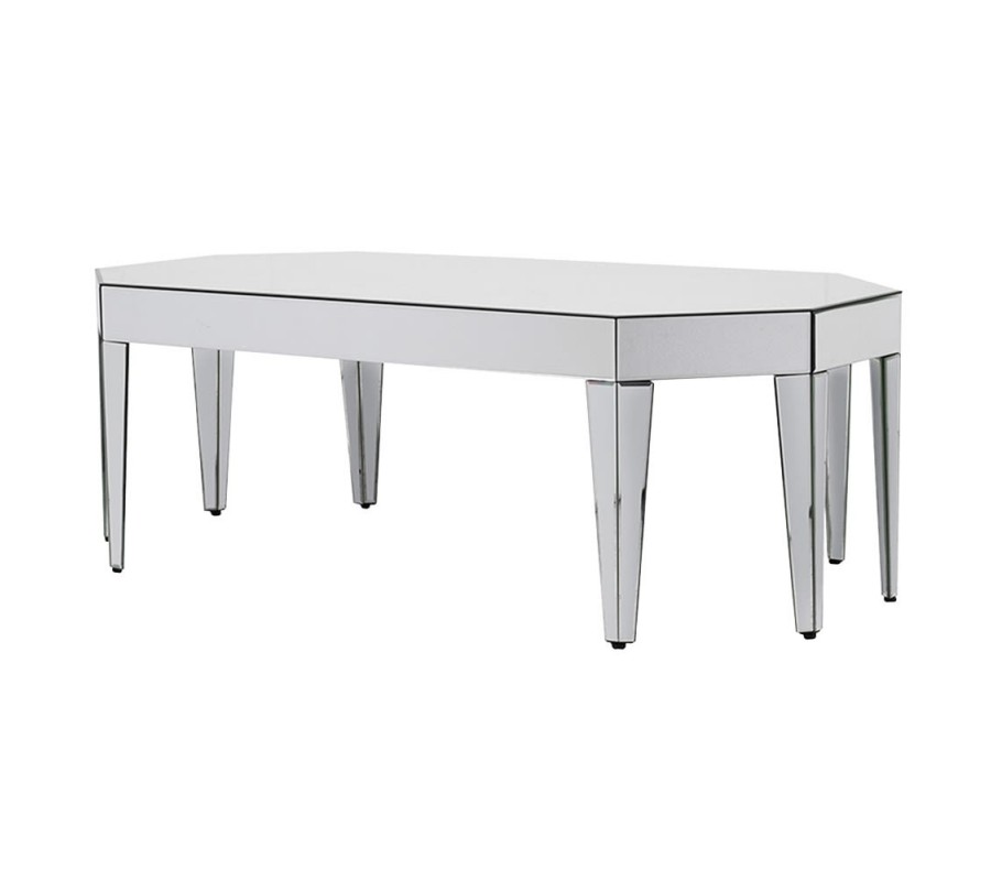 Moderný zrkadlový konferenčný stolík v tvare osemuholníka dodá priestoru jedinečnú atmosféru. Atypický tvar stolíka pozostáva zo zrkadlovej povrchovej dosky a po okrajoch sa objavuje hrubý zrkadlový pás, ktorý dodáva stolíku čaro. Konferenčný stolík stabilne drží na ôsmych elegantných atypických nohách lichobežníkového tvaru s výrazným zúžením na konci, ktoré dodávajú stolíku elegantný vzhľad. Konferenčný stolík pôsobí luxusne a hodí sa do tmavo zariadených priestorov vďaka tomu, že svojimi zrkadlovými plochami priestor presvetľuje a tým vytvára luxusný kontrast. Stolík sa hodí do miestnosti v kombinácii s ďalším zrkadlovým nábytkom, alebo s nábytkom v štýle glamour či art-deco, ktoré svojim povrchom spolu s týmto stolíkom vytvárajú zaujímavé odlesky svetla. Zaujímavé je umiestniť konferenčný stolík v miestnosti so zrkadlovým stropom, alebo so stenami obloženými zrkadlovým reliéfom.