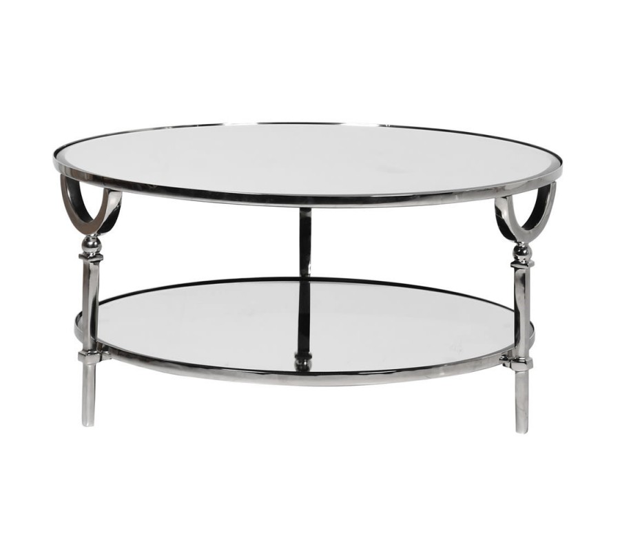 Okrúhly konferenčný stolík v Art-deco štýle určite neprehliadnete kvôli jedinečnej konštrukcii stolíka s nadčasovým dizajnom, ktorý sa nesie v duchu orientu. Na troch nohách stolíka sa nachádzajú v hornej časti oblúkové detaily, ktoré sú doplnené o menšie geometrické útvary, tým sa vytvára zaujímavý vzor a dekor nôh. Konštrukcia a nohy sú vyrobené z kovového materiálu so strieborným povrchom. Konštrukcia je doplnená dvomi zrkadlovými doskami, tým sa vytvára praktický odkladaci priestor v spodnej časti konferenčného stolíka. Konferenčný stolík kvôli lesklej striebornej farbe a zrkadlovej doske vyvoláva pocit luxusu. Stolík odporúčame kombinovať s príručným stolíkom, ktorý bol navrhnutý v rovnakom štýle, tým pádom dokonale ladia spolu. Taktiež odporúčame umiestniť konferenčný stolík do obývacej miestnosti, ktorá je zariadená v modernom, alebo Art-deco štýle.