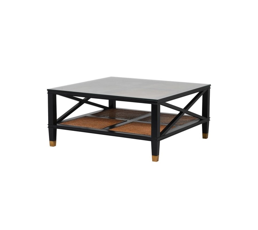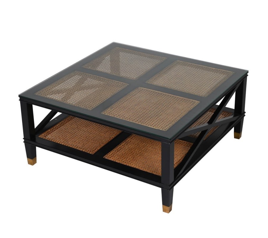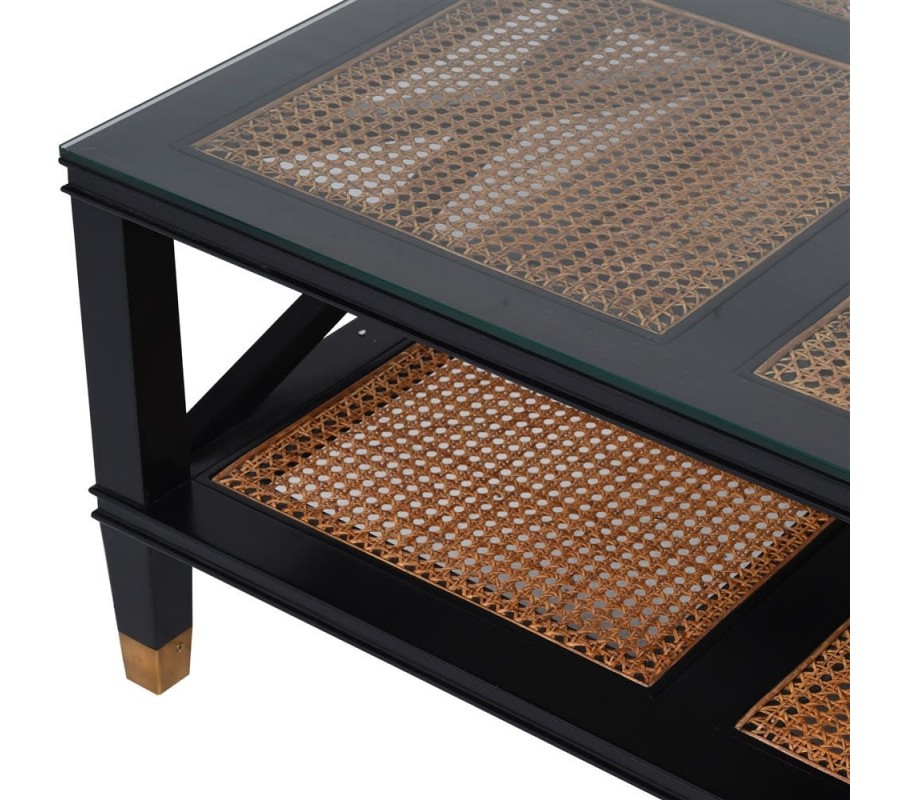 Štýlový Art-Deco konferenčný stolík vyrobený masívneho mahagónového dreva v čiernej farbe Vás jednoznačne zaujme svojím unikátnym vzhľadom. Nadčasová čierna farba je doplnená hnedými a kovovými detailmi v zlatej farbe, dodávajúc tak stolíku unikátny dizajn. Stolík Vás jednoznačne zaujme taktiež ozdobným výpletom z ratanu pod sklenenou doskou a v časti odkladacieho priestoru. Nožičky sú zdobené kovovými prvkami v zlatej farbe, ktoré dopĺňajú celkový Art-Deco dizajn stolíka. Kombinácia pleteného vzoru a prekrížených ramien na bočných stranách stolíka pôsobí originálne a zároveň nadčasovo. Povrchová doska je z číreho skla, zabezpečujúc tak praktickú údržbu povrchu. Stolík sa bude vynikajúco vynímať nie len v interiéroch zariadených v štýle Art-deco, ale aj v koloniálne či vidiecky ladených priestoroch v kombinácii s masívnym nábytkom a zlatými doplnkami.