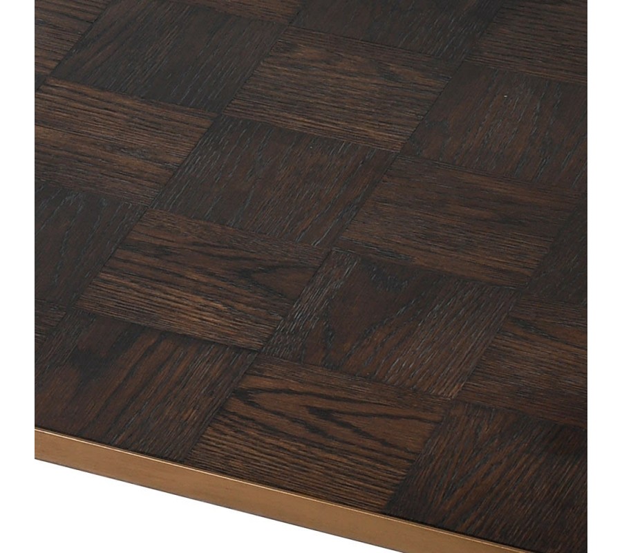 Luxusný konferenčný stolík z našej kolekcie nábytku Parketia zaujme predovšetkým svojím elegantným vzhľadom. Je vyrobený z kvalitného masívneho dubového dreva s tmavohnedou povrchovou úpravou, ktorá je zároveň obohatená parketovým vzorom striedajúcim svetlejší a tmavší odtieň a kresbu dreva. Prírodný materiál dopĺňa konštrukcia z kovu v luxusnej zlatej farbe, ktorá stolíku dodáva štýlový art-deco nádych. Tento jedinečný kúsok krásne je vhodný predovšetkým do elegantných art-deco či moderne ladených obývačiek a vytvorí nádhernú kombináciu s naturálnymi farbami ako je zelená, červená či oranžová. Odporúčame taktiež ďalšie kúsky z kolekcie Parketia.