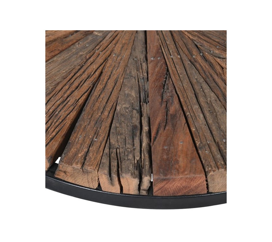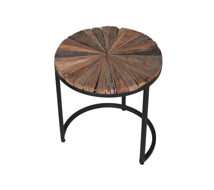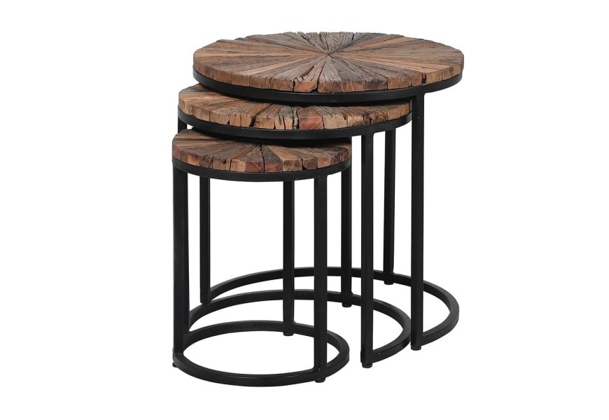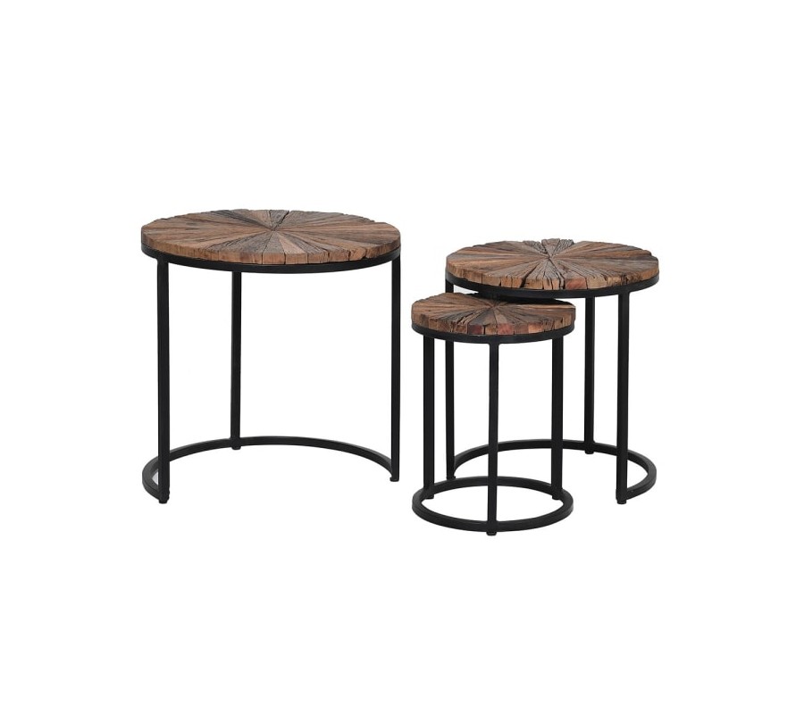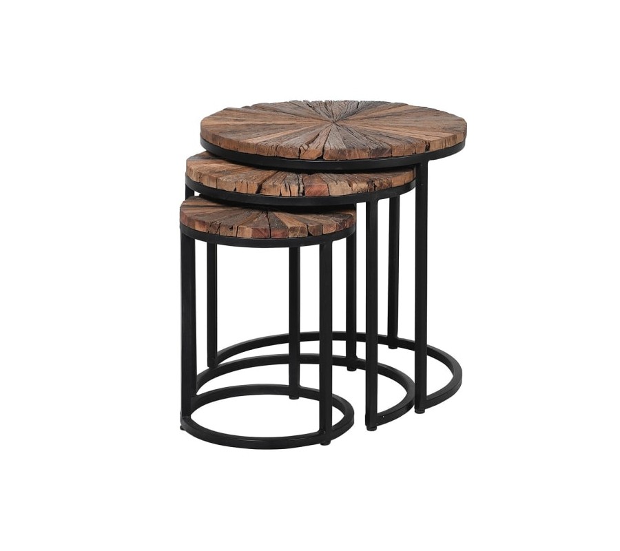 Sada troch okrúhlych konferenčných stolíkov, zapadajúcich do seba, vás jednoznačne už na prvý pohľad zaujme svojím jedinečným prevedením. Kovová podstava stolíkov v čiernej farbe je tvorená kruhovým rámom, do ktorého je osadená drevená vrchná doska, spodným kruhom, ktorý dodáva stolíkom stabilitu a tromi tenkými nožičkami, ktoré spájajú vrchný a spodný kruh. Vrchná doska stolíkov je vytvorená z mangového a akáciového dreva, s povrchovou úpravou zachovávajúcou prirodzenú štruktúru dreva, ktoré bolo spracované do tvaru tenkých trojuholníkov, vytvárajúc tak lúčovitú mozaiku na vrchu stolíkov. Set troch okrúhlych konferenčných stolíkov odporúčame kombinovať s doplnkami v prirodzených naturálnych odtieňoch a s doplnkami z prírodných materiálov či vkusného kovu. Stolíky sa budú vynikajúco vynímať najmä v obývacích izbách, halách či kanceláriách ladených v industriálnom štýle.