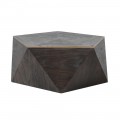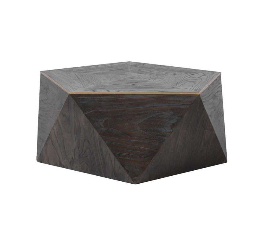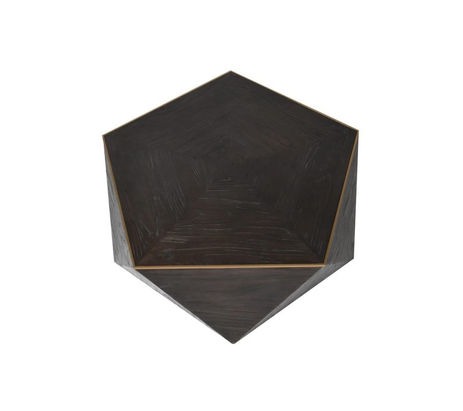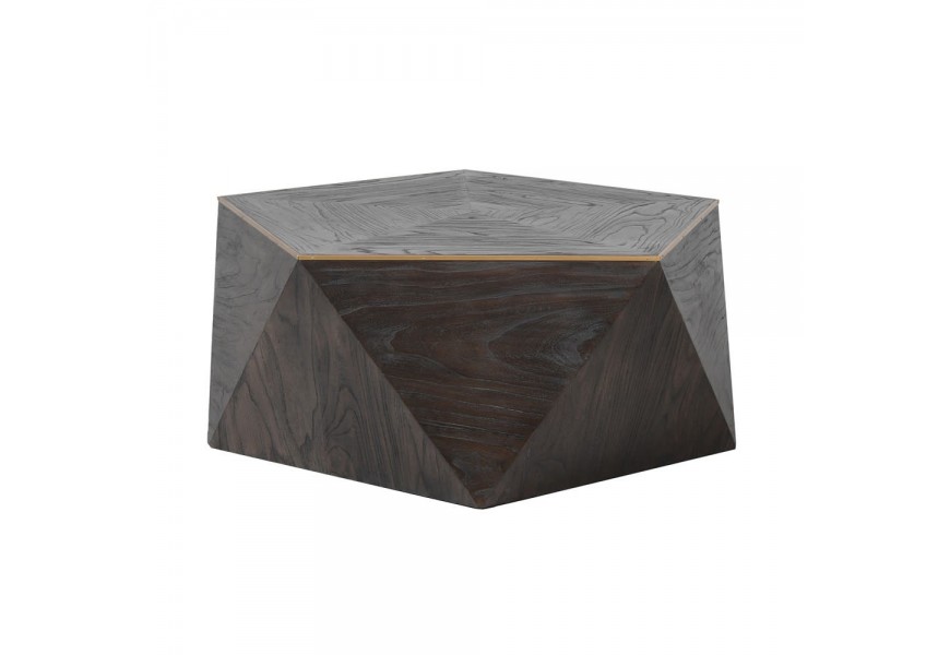Jedinečný konferenčný stolík v tvare päťuholníka zaujme každého milovníka masívneho nábytku s moderným a nadčasovým dizajnom. Konferenčný stolík je vyrobený z masívneho brestového dreva v čiernej farbe a je doplnený o dekoračné medené prvky. Masívna geometrická podstava je vytvorená z poprepájaných trojuholníkov, na ktorých je viditeľná štruktúra dreva. Okraj je doplnený dekoratívnou decentnou líniou z medeného materiálu. Na doske konferenčného stolíka je z vrchu viditeľná štruktúra drevených dosiek, ktoré vytvárajú takisto tvar päťuholníka. Stolík odporúčame umiestniť do obývačiek, kancelárií, či hál. Hodí sa do svetlejších miestností s neutrálnou farbou, ktoré sú doplnené napríklad ďalšími tmavými nábytkami z masívu, alebo nábytkami z kolekcie Ramia, ako napríklad dizajnovým čiernym príručným stolíkom Ramia v tvare päťuholníka. Priestoru dodajú čaro bytové doplnky, ktoré sú vyrobené z medeného materiálu, ako napríklad hodinky, misky, či svietniky. Tento jedinečný kúsok príjemne ozvláštni akýkoľvek interiér.