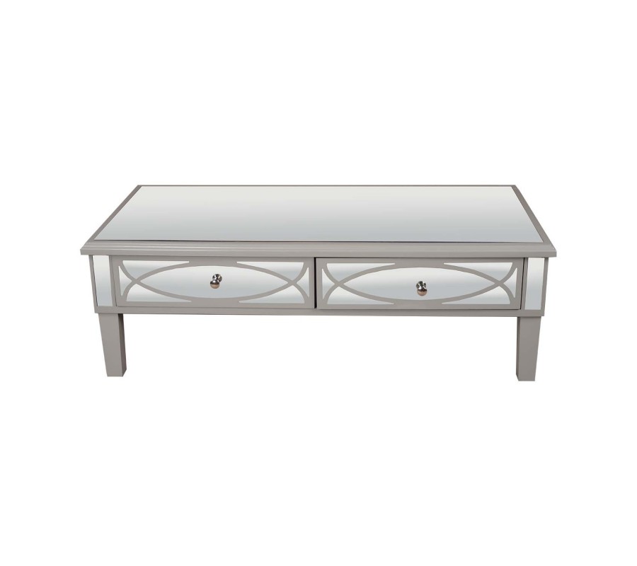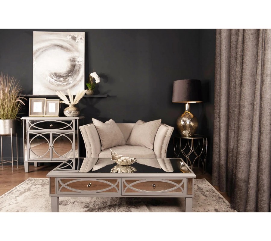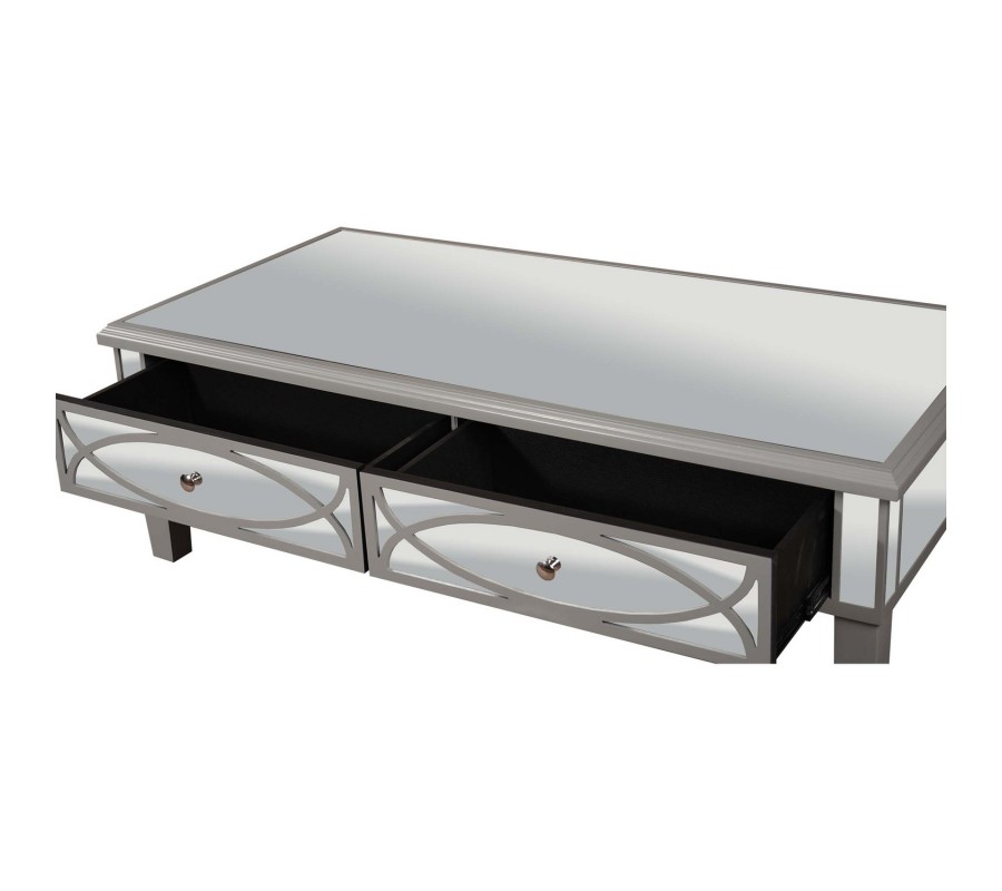 Luxusný zrkadlový konferenčný stolík z rady art-deco zrkadlového nábytku Padme je nádherným predstaviteľom zrkadlového nábytku. Jedinečná kombinácia lesklých zrkadlových plôch so strieborným lineárnym zdobením striebornej farby a strieborných hrán a rukovätí pôsobí veľmi nadčasovo a nestarnúco. Luxusný obdĺžnikový konferenčný stolík Padme disponuje dvoma priestrannými zásuvkami, ktoré Vám dodajú dostatok bonusového úložného priestoru na drobnosti, ktoré by prekážali vo Vašej dokonalej vízii štýlovej obývačky či kancelárie. Konferenčný stolík Padme je na dostatočne vysokých nožičkách čo patrične zjednodušuje upratovanie a odporúčame ho kombinovať najmä s výraznými odtieňmi chladných farieb či striebornými dekoráciami a zamatovými vankúšmi.