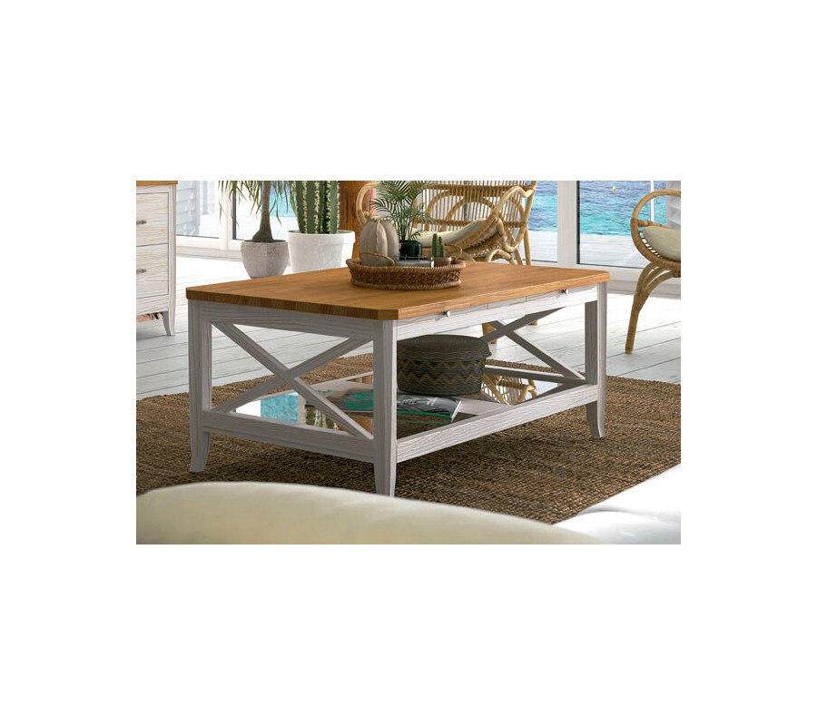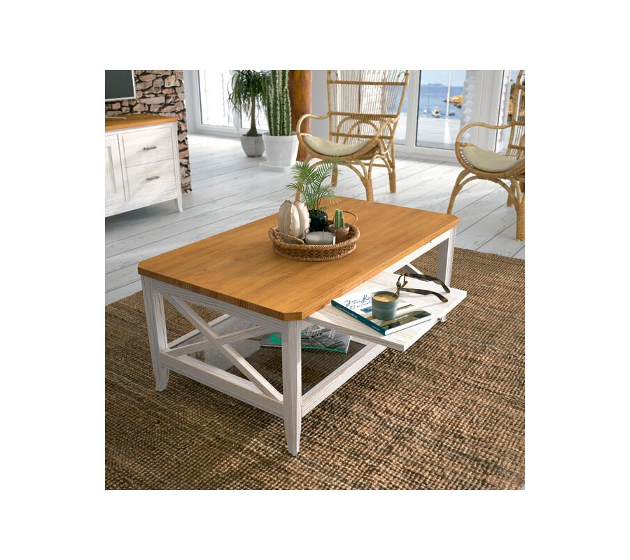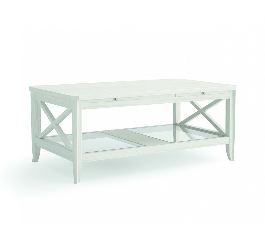 Luxusný vidiecky masívny obdĺžnikový konferenčný stolík Genova so sklenenou a výsuvnými policami 117 cm