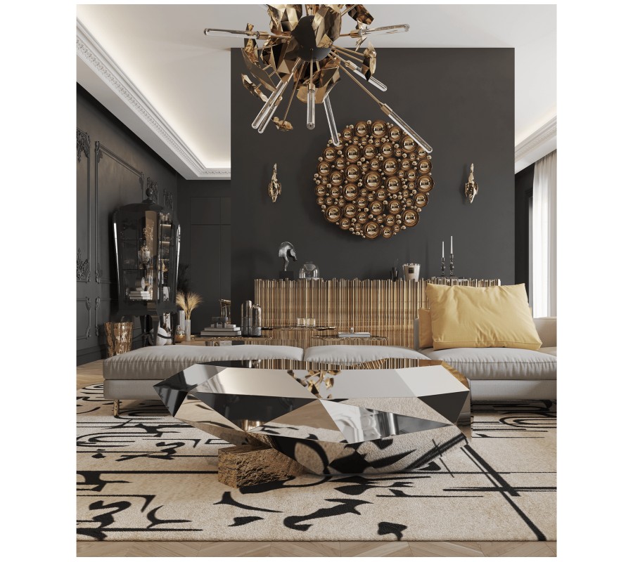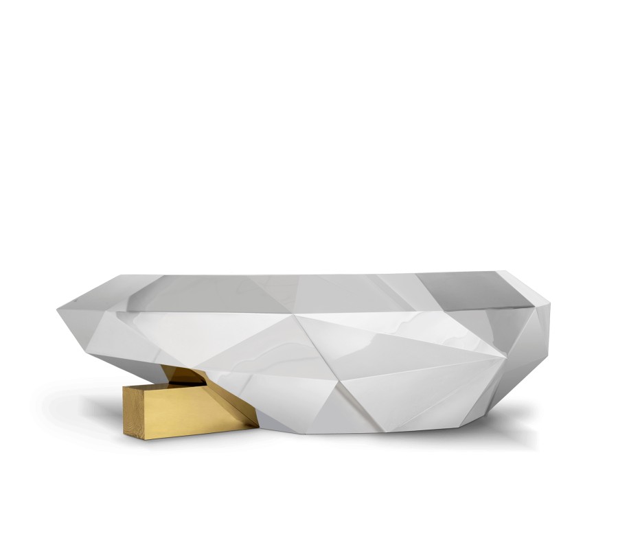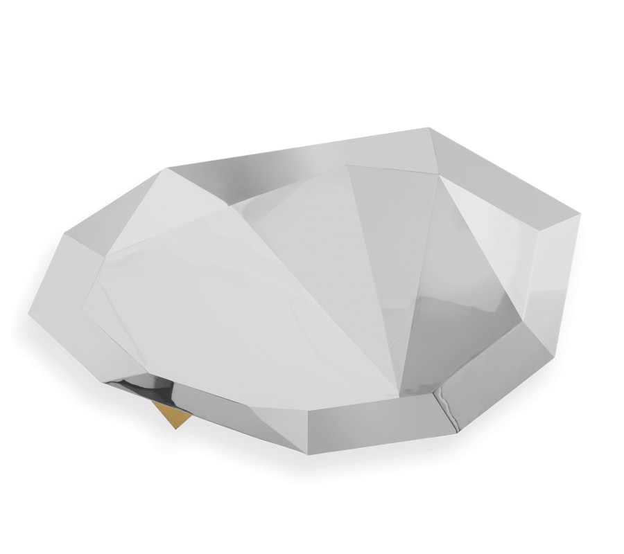 Luxusný konferenčný stolík Diamond v striebornom prevedení predstavuje spojenie odbornosti a kvintesencie nábytkárskeho portugalského klenotníka. Moderný dizajnový konferenčný stolík v štýle art-deco reinterpretuje najžiadanejší drahokam a predstavuje skutočné umelecké dielo pre Váš interiér. Vďaka lomeným hranám masívnej základne s povrchovou úpravou z leštenej nehrdzavejúcej ocele môžete sledovať hru svetla. Exkluzívny konferenčný stolík predstavuje ako umelecké dielo tak i praktický pozlátený úložný priestor pozostávajúci z políc a dvoch zásuviek ukrytými za tvarovanými dvierkami. Masívna základňa konferenčného stolíka v štýle art-deco je zasadená do leštenej mosadznej nohy, ktorá vďaka svojmu precíznemu zdobeniu pripomína skutočné drevo. Konferenčný stolík predstavujúci spojenie gotiky a romantizmu jedinečne doplní každý priestranný a svetlý interiér zariadený v modernom či art-deco štýle. Dizajnový konferenčný stolík odporúčame kombinovať s moderným nábytkom a art-deco dekoráciami.