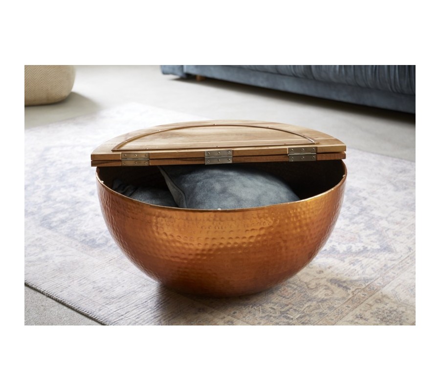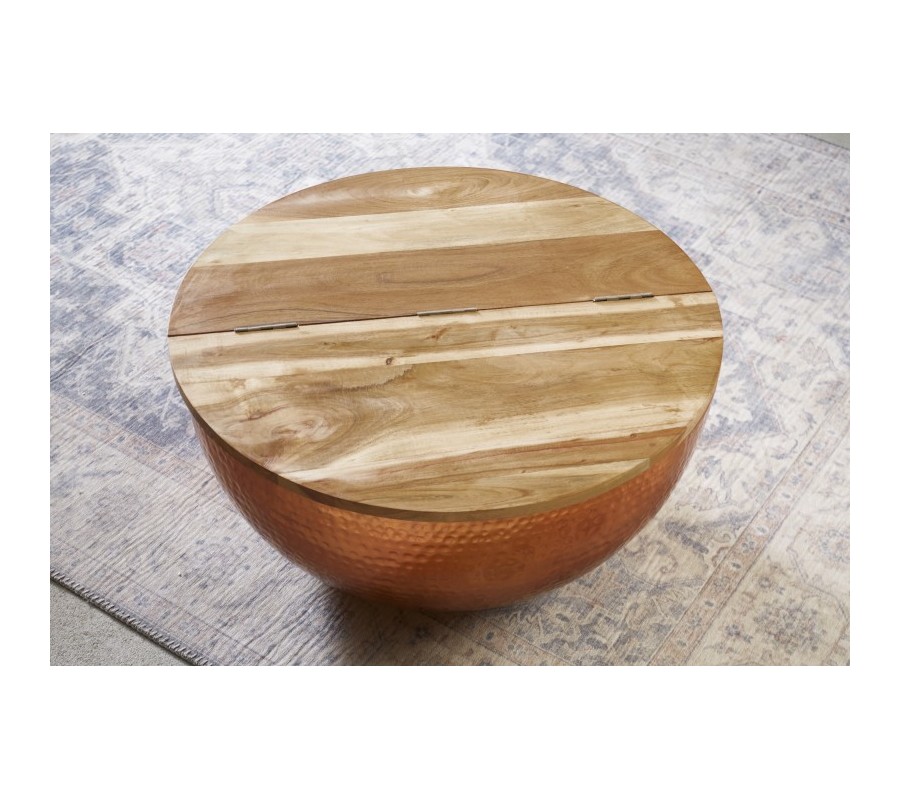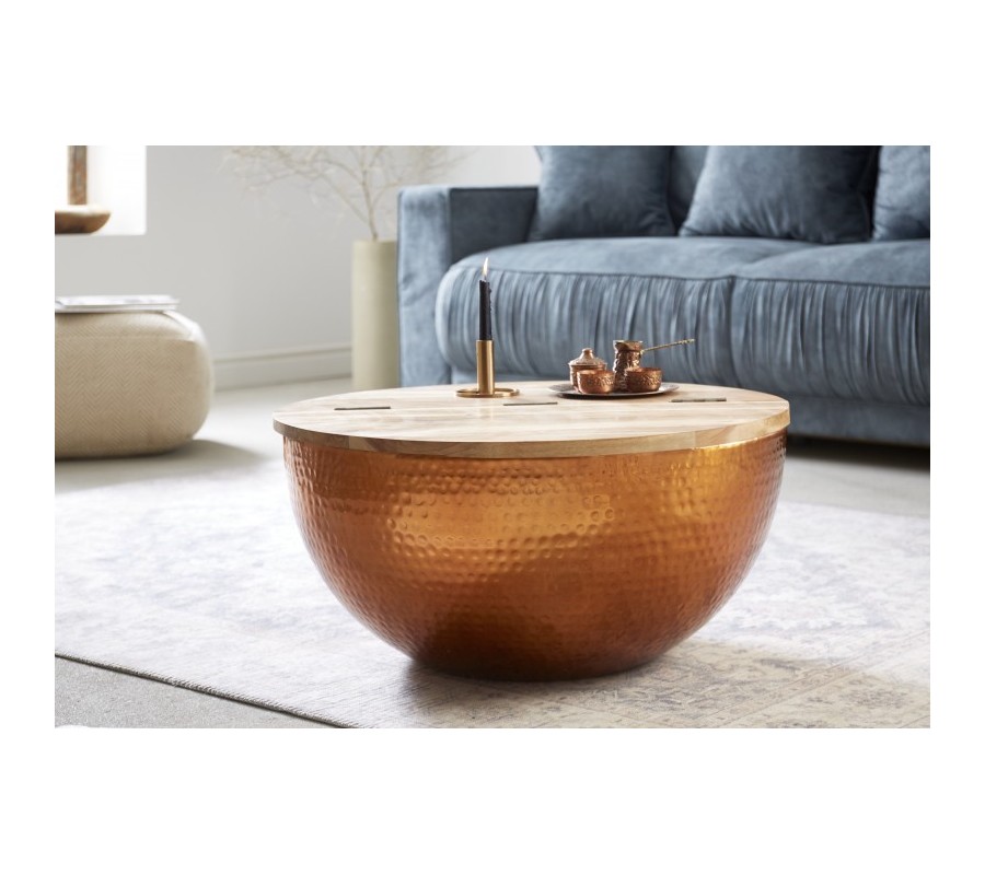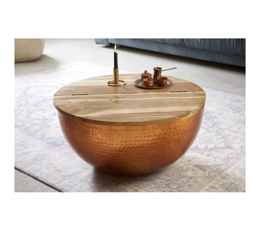 Dizajnový konferenčný stolík Hammerblow je zaujímavý svojím netradičným vzhľadom, ktorý kombinuje oválny orientálny základ s masívnou vrchnou doskou. Spomenutý kovový základ sa nesie v medenej farbe, pričom jeho orientálne pôsobiaci dizajn vytvára zaujímavý kontrast s masívnou vrchnou doskou z akáciového dreva. Vrchná doska konferenčného stolíka Hammerblow sa pýši povrchovou úpravou vyzdvihujúcou naturálny vzhľad dreva, a taktiež vám tento jedinečný stolík ponúka aj priestor pre odklad vaších vecí. Jedna strana vrchnej dosky je otvárateľná, a tak vám ponúka možnosť využiť základ konferenčného stolíka ako sofistikovaný úložný priestor. Štýlový konferenčný stolík Hammerblow kombinuje moderný a orientálny štýl nábytku, preto ho odporúčame kombinovať vo svetlo zariadených moderných interiéroch s výraznými medenými alebo orientálnymi doplnkami.