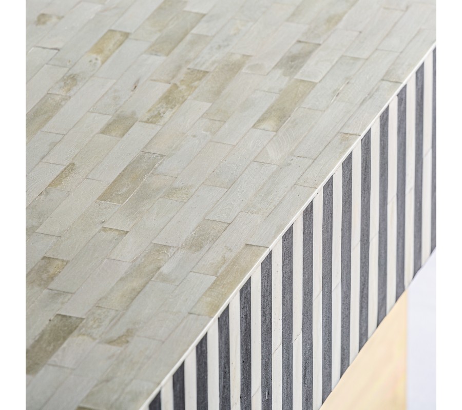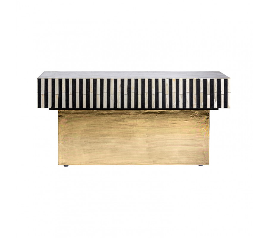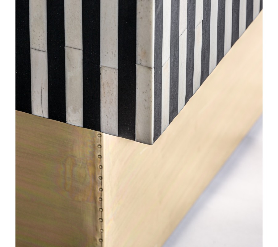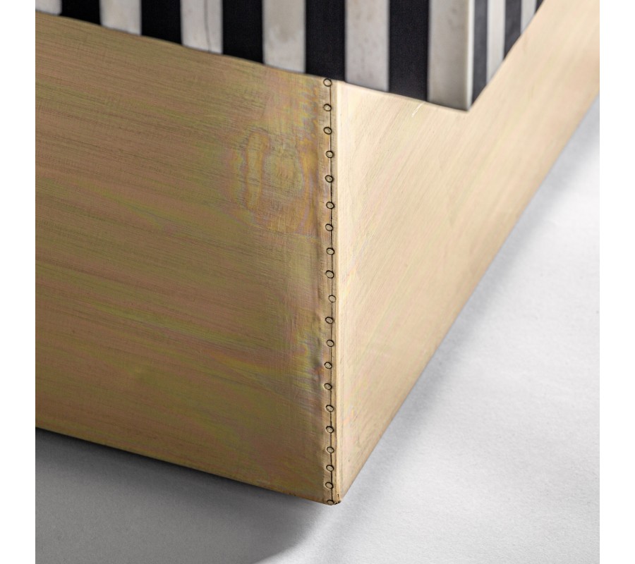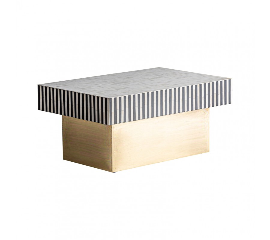 Jedinečný konferenčný stolík Caderina sa vyznačuje svojím elegantným dizajnom s nádychom art-deco štýlu. Pozostáva z podstavy zlatej farby a čierno-bielej pruhovanej povrchovej dosky z kombinácie MDF, mosadze a kosti. Mohutná konštrukcia vynikne v luxusne ladených obývačkách či priestoroch opulentne zariadených kaviarní v štýle 20. rokov 20. storočia. Farebná a materiálová kombinácia vytvára nezameniteľný art-deco vzhľad, ktorým vhodne doplníte aj moderne ladené priestory. Konferenčný stolík z našej kolekcie Caderina sa dá vhodne kombinovať s bohatými dekoráciami, výraznými obrazmi so zlatým rámom, kobercom s dlhým vlasom či luxusnou čalúnenou zamatovou sedačkou.