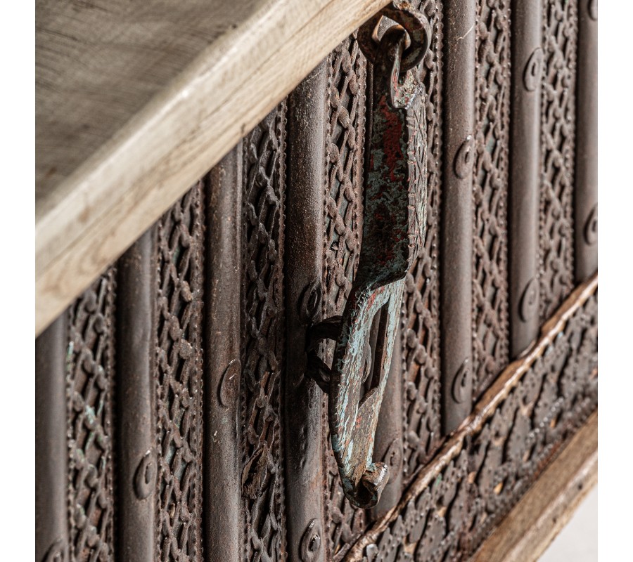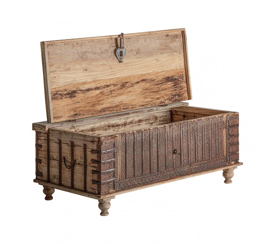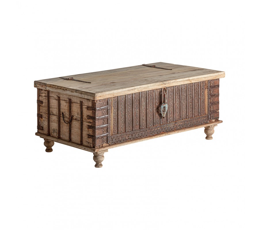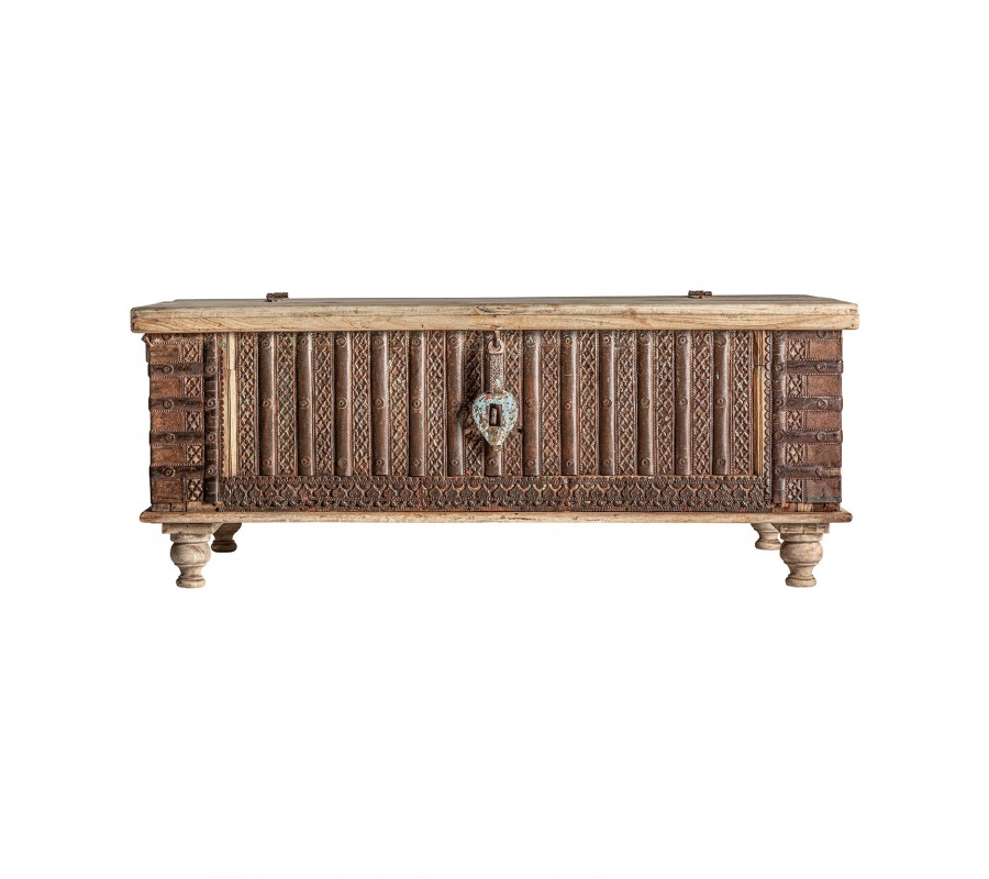 Jedinečný konferenčný stolík Vallexa zaujme svojím unikátnym dizajnom v etno štýle. Je vyrobený z masívneho teakového dreva, ktoré zdobí bohaté ornamentálne vyrezávanie. Naturálna úprava dreva sa snúbi s detailnými vzormi a vyrezávanými nožičkami, vďaka čomu vzniká unikátny dizajn prepájajúci prírodné prvky s orientálnymi vplyvmi. Bočné steny zdobí kovová výzdoba v podobe vybíjaných plieškov s vintage nádaychom a nachádzajú sa tu tiež ozdobné úchyty v podobe štýlových povrazov. Konferenčný stolík Vallexa okrem štýlového vzhľadu poteší aj úložným priestorom vo svojom vnútri. Prírodnú hnedú farbu dopĺňa naturálna kresba dreva a dizajnové prvky na hranách vytvárajúce efekt lodnej truhlice. Štýlový konferenčný stolíkn Vallexa vynikne v etno, vidiecky či orientálne ladených obývačkách v kombinácii s doplnkami v prírodných zemitých odtieňoch či výraznejšími dekoráciami z kovu.
