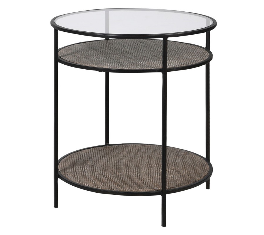 Sklenený okrúhly príručný stolík Diveni Black s otvoreným úložným priestorom s čiernou kovovou konštrukciou 63cm