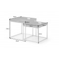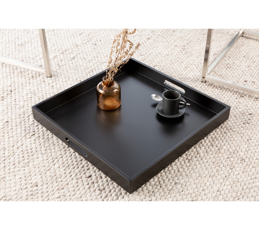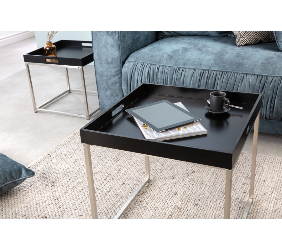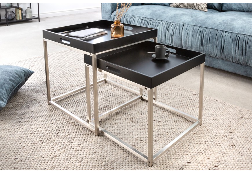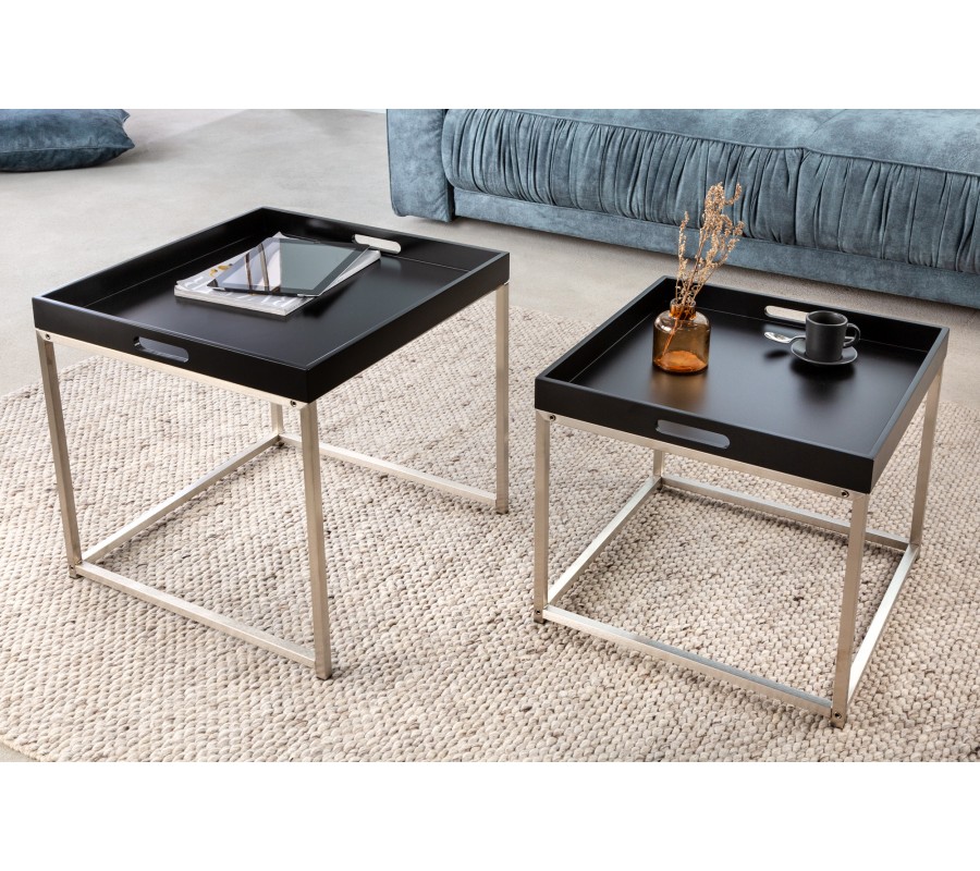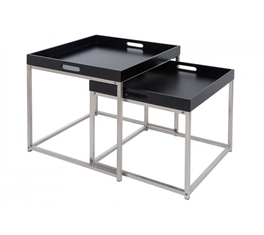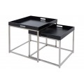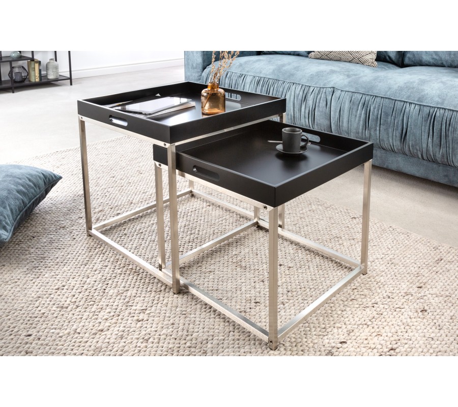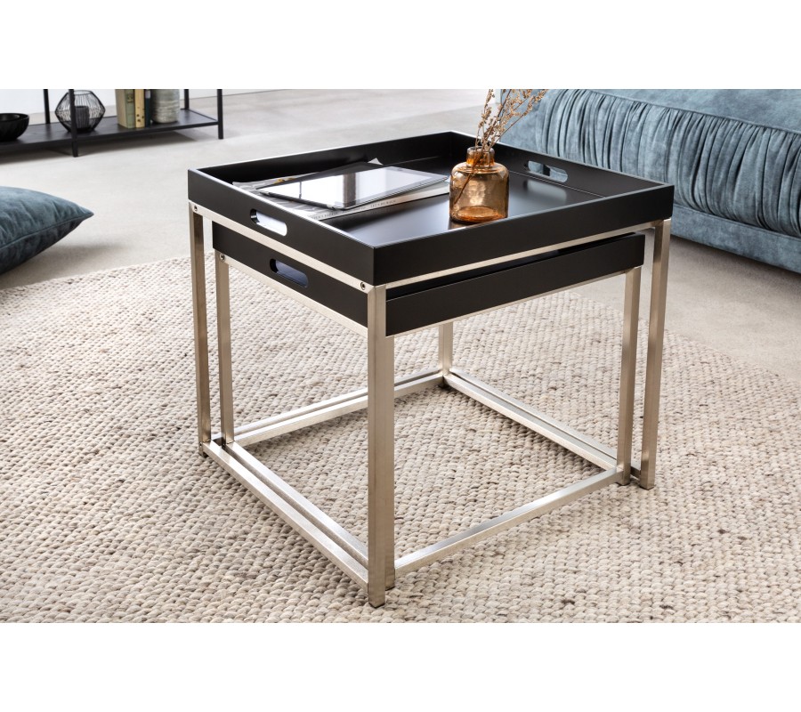 Vkusný set dvoch konferenčných stolíkov Elements je vyhotovený z kombinácie čiernych povrchových dosiek z dreva s lakovaným povrchom a strieborných kovových nôh chrómovej farby s chrómovou povrchovou úpravou. Set konferenčných stolíkov Elements je vyrobený s dôrazom na moderný štýl a dokonale zapadne do nejednej moderne a dizajnovo ladenej domácnosti. Na sade konferenčných stolíkov Elements taktiež oceníte ich možnosť snímateľnej povrchovej dosky, čo vytvára užitočný podnos využiteľný na servírovanie pokrmov vopred či na raňajky do postele v lenivé ráno a taktiež jeho kompaktnosť, možnosť rýchlo rozložiť pri nečakanej návšteve a zložený využívať i ako príručný stolík veďla sedačky. Set stolíkov Elements odporúčame v rámci obývačiek kombinovať najmä s keramickými vázami či inými chrómovými dekoráciami.