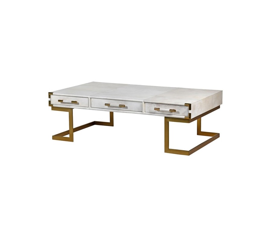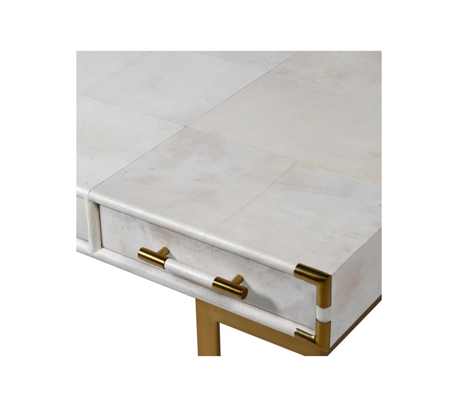 Exkluzívny konferenčný stolík Pellia Marble osloví predovšetkým milovníkov art-deco štýlu a inovatívneho dizajnu. Vzhľad tohto kúsku je unikátny najmä vďaka poťahu z pravej kože, ktorý sa nesie v jemných bielo-krémových odtieňoch s mramorovým vzorom. Zlatá konštrukcia z kovu dotvára nádych art-deco štýlu, ktorý krásne doplní priestory noblesne ladených interiérov. Stolík disponuje tromi praktickými zásuvkami so zlatými rukoväťami. Kombinácia kvalitných materiálov a elegantného dizajnu robí z tohto kúsku skutočne jedinečný doplnok do vašej obývačky či priestorov opulentne ladených kaviarní či beauty salónov. Konferenčný stolík Pellia Marble odporúčame kombinovať aj s ďalšími kúskami z tejto kolekcie a s dekoráciami v zlatých odtieňoch.