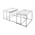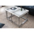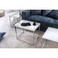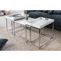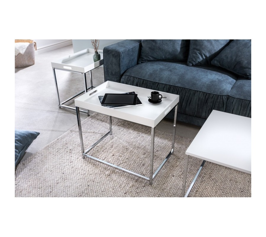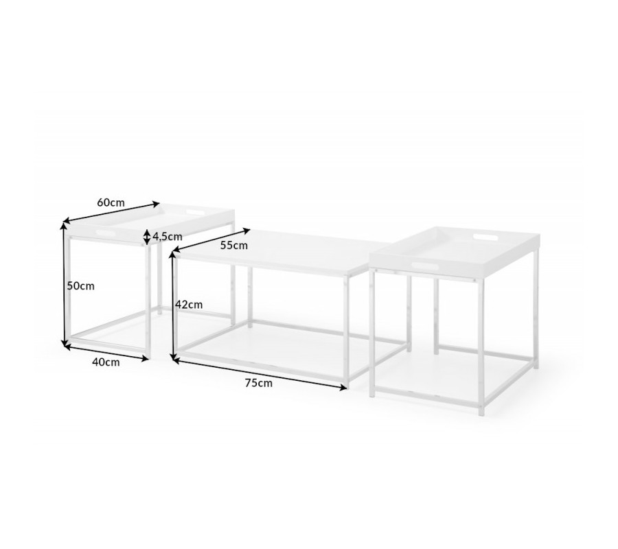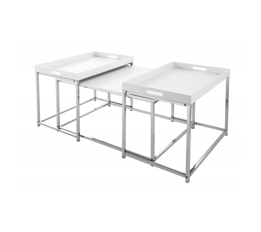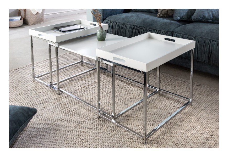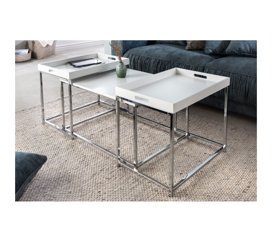 Sada troch moderných chrómových konferenčných stolíkov Blancheta s bielymi odnímateľnými podnosmi 75cm