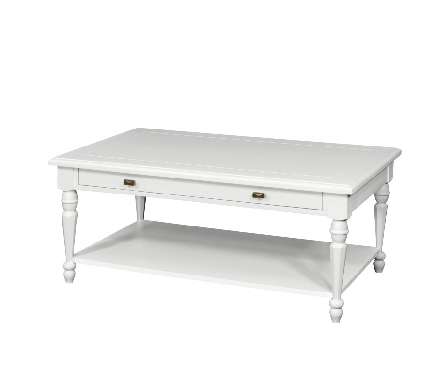 Biely provensálsky konferenčný stolík Belliene z vyrezávaného masívneho dreva s tvarovanými nožičkami a zásuvkou 122cm