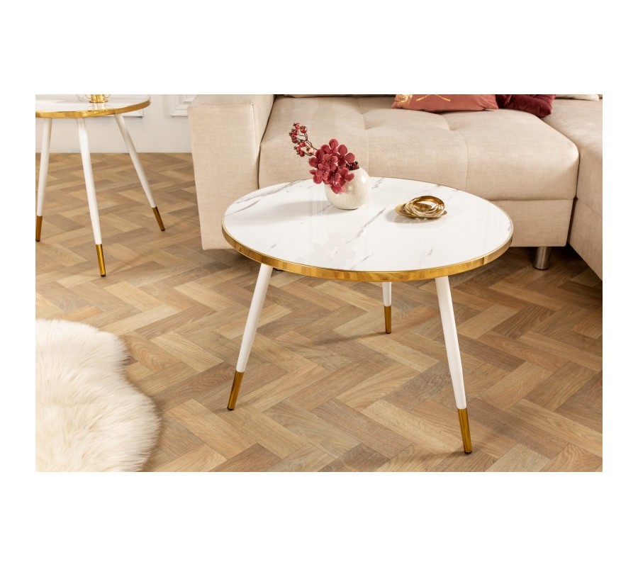 Elegantný art-deco okrúhly konferenčný stolík Nudy v bielo zlatom prevedení s kovovým rámom a mramorovým dizajnom 60cm