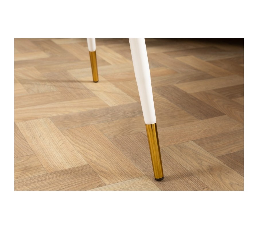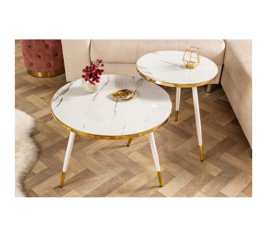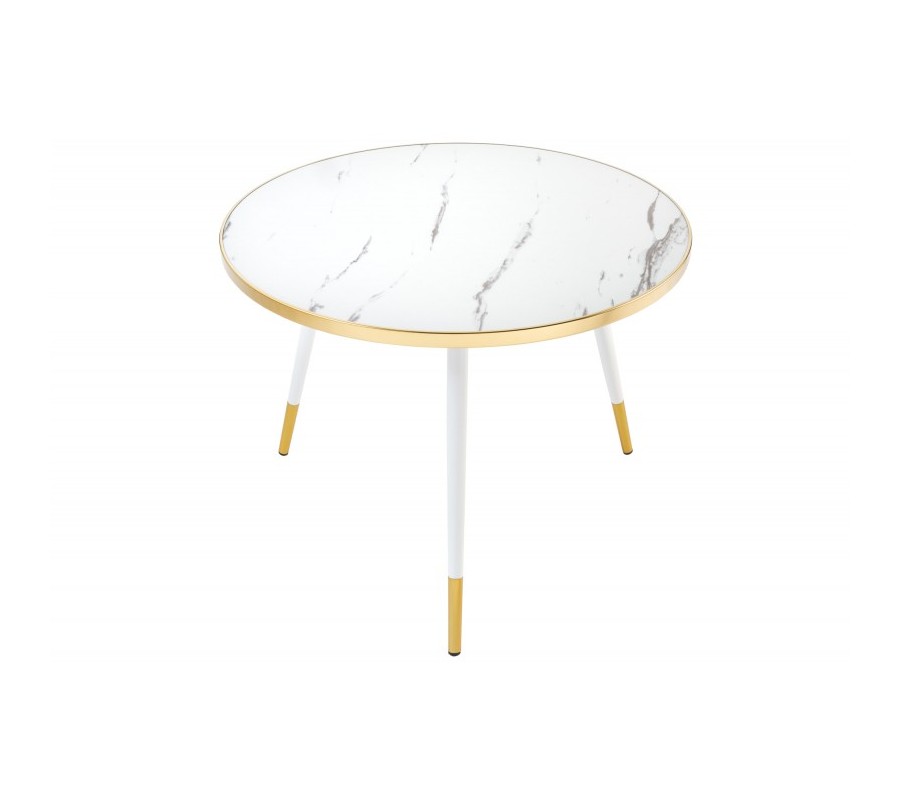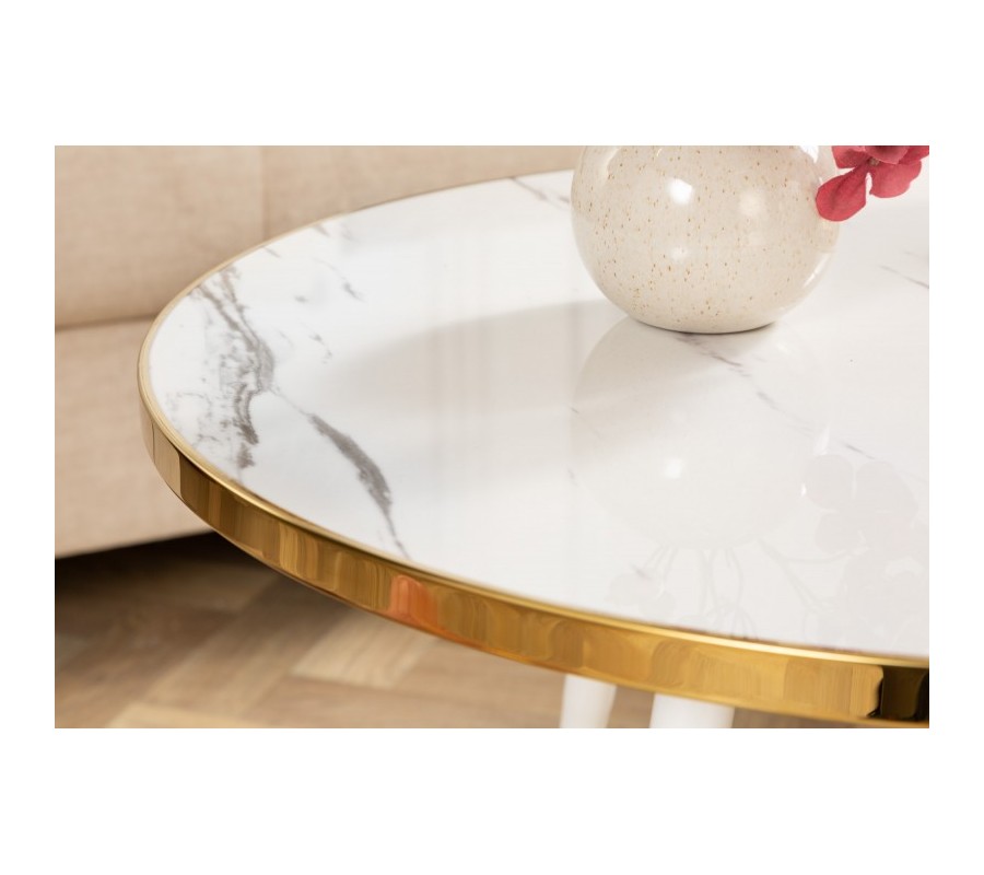 Okrúhly konferenčný stolík Nudy v art-deco štýlovom prevedení vás zaujme svojím unikátnym, luxusne pôsobiacim dizajnom, ktorý kombinuje univerzálnu bielu farbu s majestátnou zlatou. Okrúhla vrchná doska stolíka Nudy sa môže pýšiť mramorovým dizajnom na sklenenej doske, ktorá je taktiež po svojom kraji obklopená kovovým rámom zlatej farby. Biely mramorový dizajn so zlatými prvkami je doplnený tromi priamymi nožičkami, ktoré sa podobne ako vrchná doska hrajú s farbami bielej a zlatej. Biele nožičky sú zakončené v kovovom prevedení zlatej farby, čím sa podčiarkuje art-deco štýlový dizajn konferenčného stolíka Nudy. Vďaka svojmu farebnému vyhotoveniu odporúčame kombinovať konferenčný stolík Nudy v art-deco alebo moderných interiéroch v kombinácií s príručným stolíkom Nudy, s bielym moderným nábytkom so zlatými prvkami a so zlatými dekoráciami.