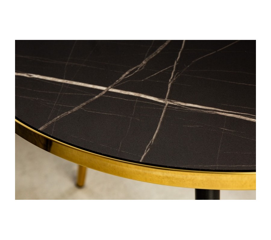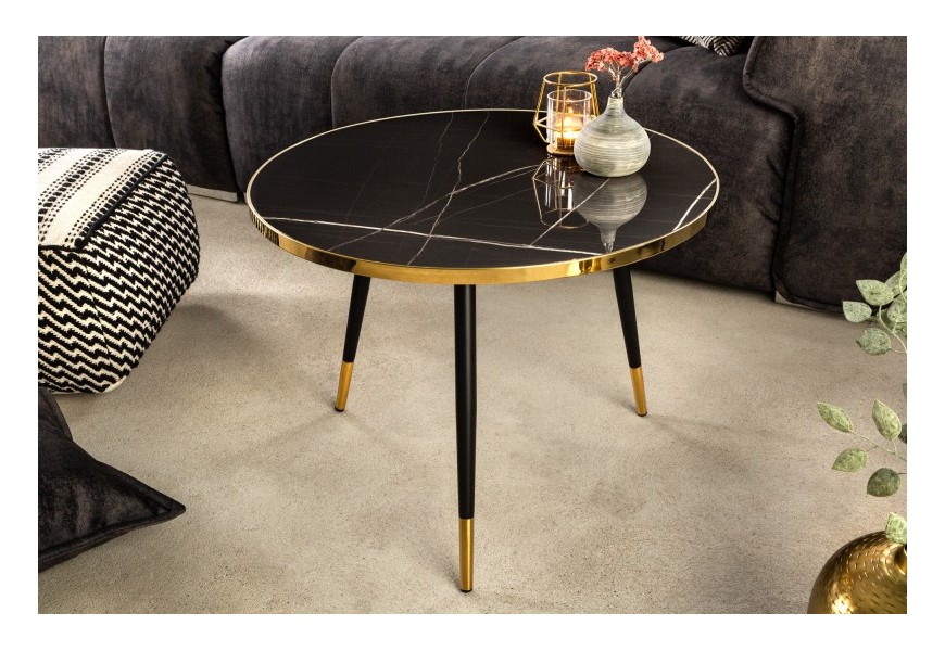 Art-deco okrúhly konferenčný stolík Nudy s vrchnou doskou s čiernym mramorovým dizajnom s nožičkami v zlatom zakončení 60cm