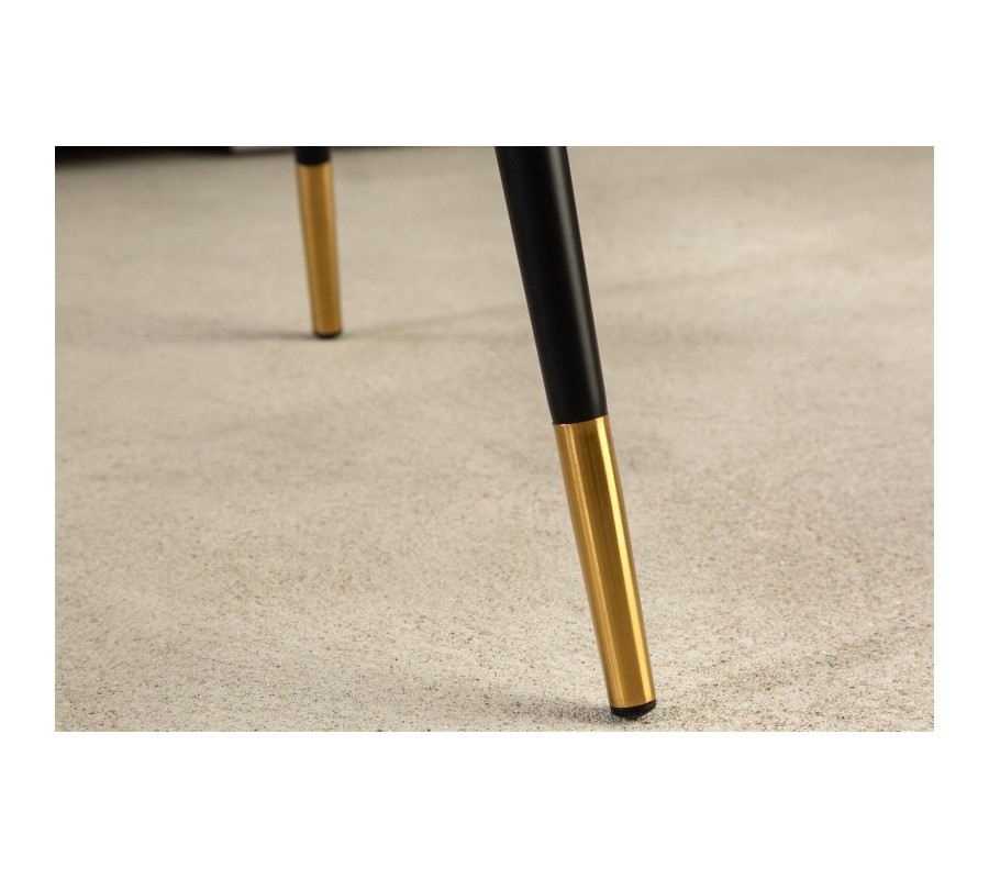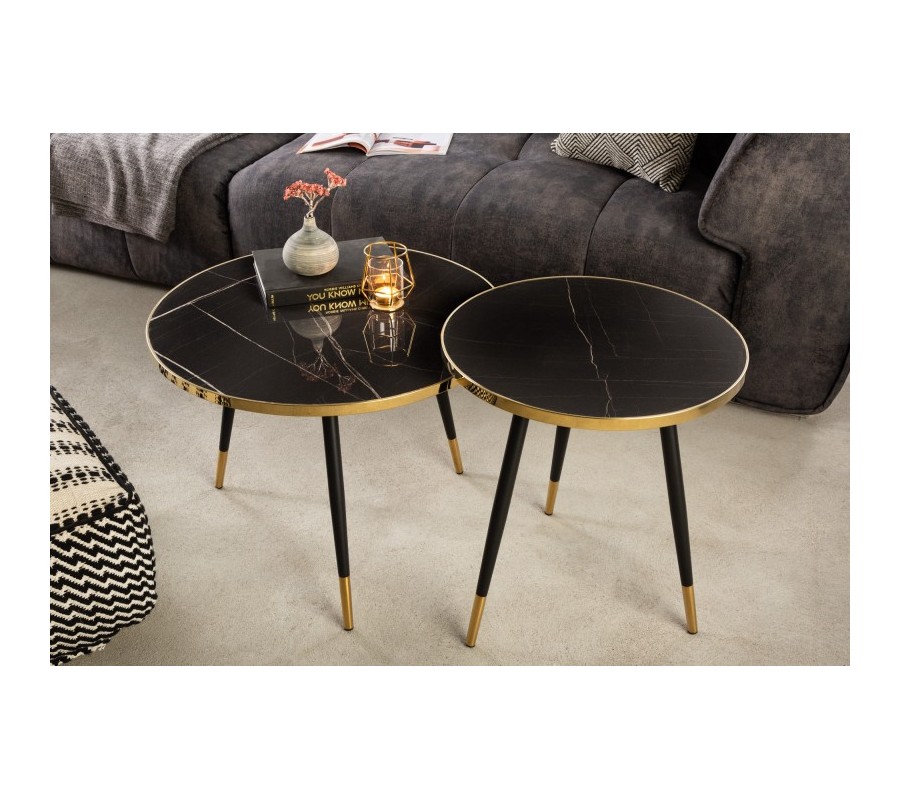 Konferenčný stolík Nudy v okrúhlom tvare vás zaujme svojím lákavým dizajnom, ktorý kombinuje univerzálnu čiernu farbu so zlatou, ktorá dodáva luxusný vzhľad týmto produktom. Podčiarknutie luxusného vzhľadu je vo forme vrchnej dosky s mramorovým vzhľadom. Čierne vyhotovenie sa nachádza aj na nožičkách konferenčného stolíka Nudy, pričom zakončenie spomenutých nožičiek sa nesie v kovovom vyhotovení zlatej farby, ktoré krásne dopĺňa rám vrchnej dosky taktiež v zlatej farbe. Zlaté prvky dizajnového konferenčného stolíka Nudy sú typické pre štýl Art-deco, preto tento produkt odporúčame kombinovať so zlatými dekoráciami, s farebnými sedačkami so zlatými nožičkami, poprípade aj v luxusných interiéroch, ktoré sa nesú v čiernej a zlatej farbe.