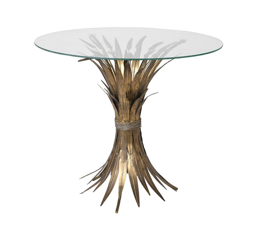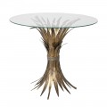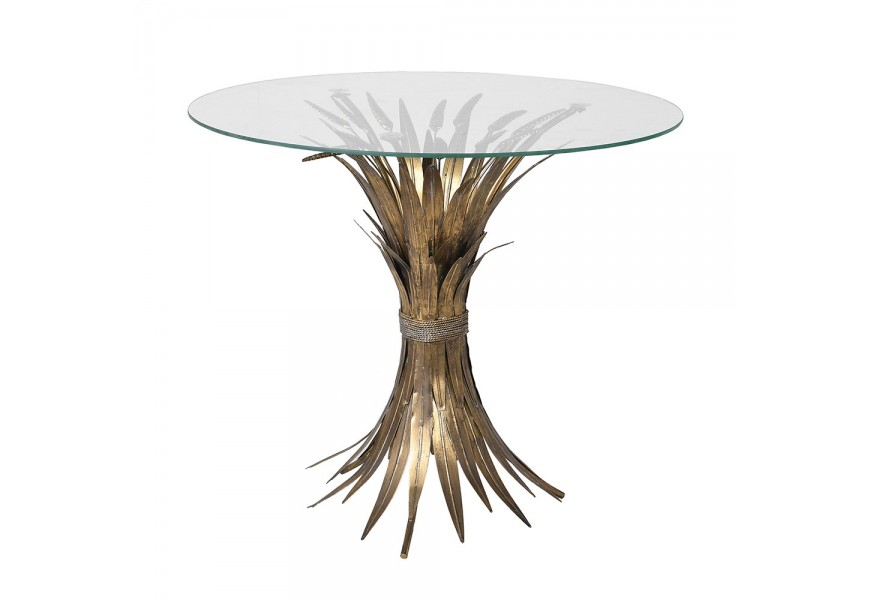 Konferenčný stolík Wheat s okrúhlou sklenenou doskou a kovovou podstavou vintage zlatej farby s dizajnom zväzku pšenice 60cm