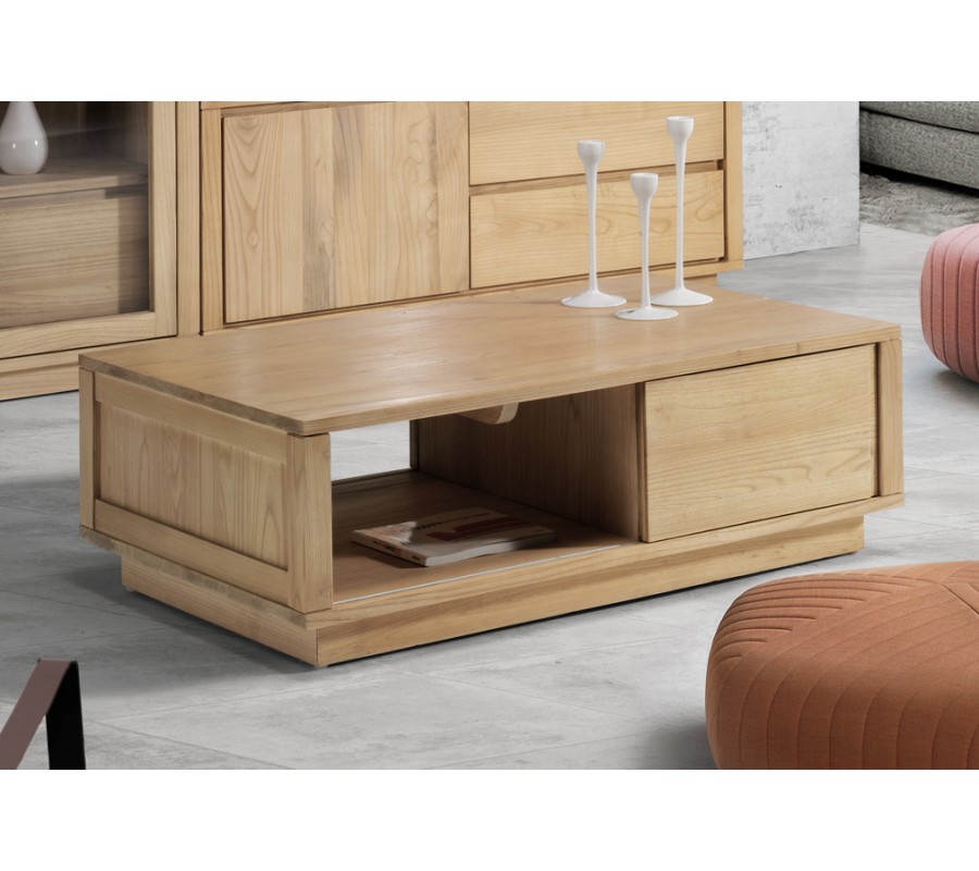 Moderný škandinávsky konferenčný stolík Fjordar z masívu s poličkou a zásuvkou bledo hnedý obdĺžnikový 120cm