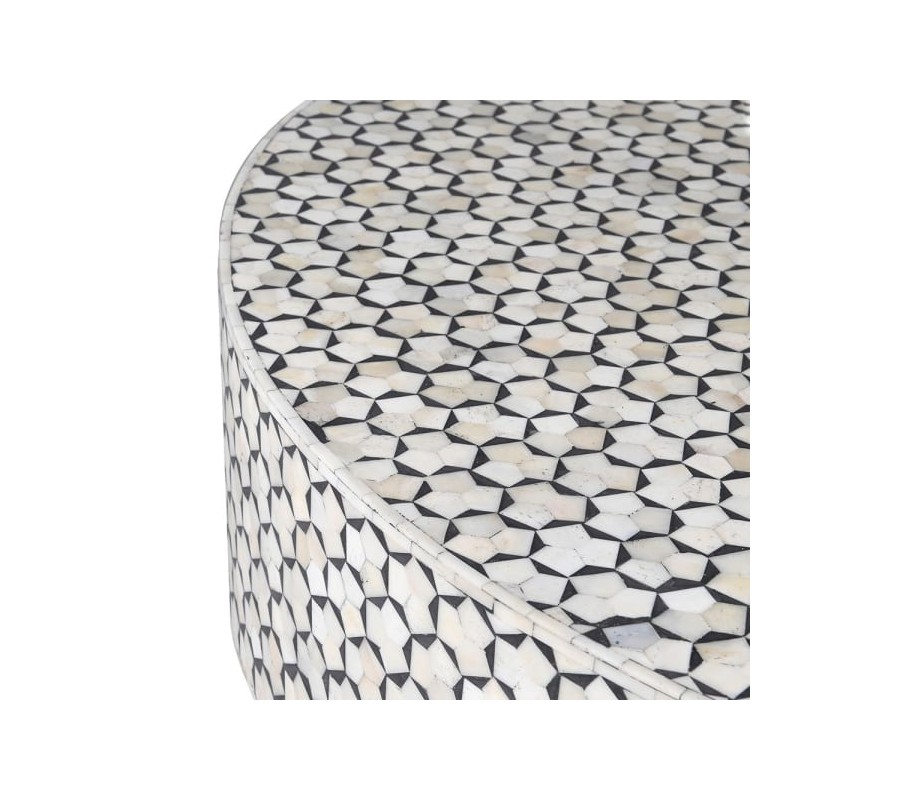 Exkluzívny konferenčný stolík Daytona predstavuje prepojenie nadčasového dizajnu s prvkami štýlu art deco. Tento unikátny kúsok vás prenesie do luxusných víl dvadsiatych rokov dvadsiateho storočia, ktoré sa vyznačovali svojou pompéznosťou, luxusným vzhľadom a dôrazom na noblesu. Konferenčný stolík Daytona vyrobený z dreva zaujme okrem svojho štýlového okrúhleho tvaru najmä svojím originálnym zdobením. Čierno-biele geometrické vzory pokrývajúce celú povrchovú dosku sú vytvorené technikou bone inlay, intarzie využívajúcej precízne opracované kúsky ťavej kosti a živice. Takýmto spôsobom vzniká unikátny vzhľad s elegantným hladkým povrchom. Celkový art deco efekt umocňuje okrúhla podstava zlatej farby. Pre dosiahnutie dokonalého efektu odporúčame konferenčný stolík Daytona kombinovať s koženým či zamatovým čalúneným kreslom či sedačkou, výraznými doplnkami a dekoráciami zo skla či kovu.