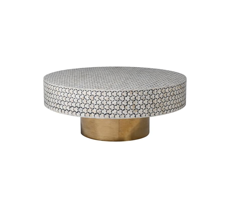 Art-deco okrúhly konferenčný stolík Daytona s čierno-bielym bone inlay dizajnom a so zlatou podstavou 107cm