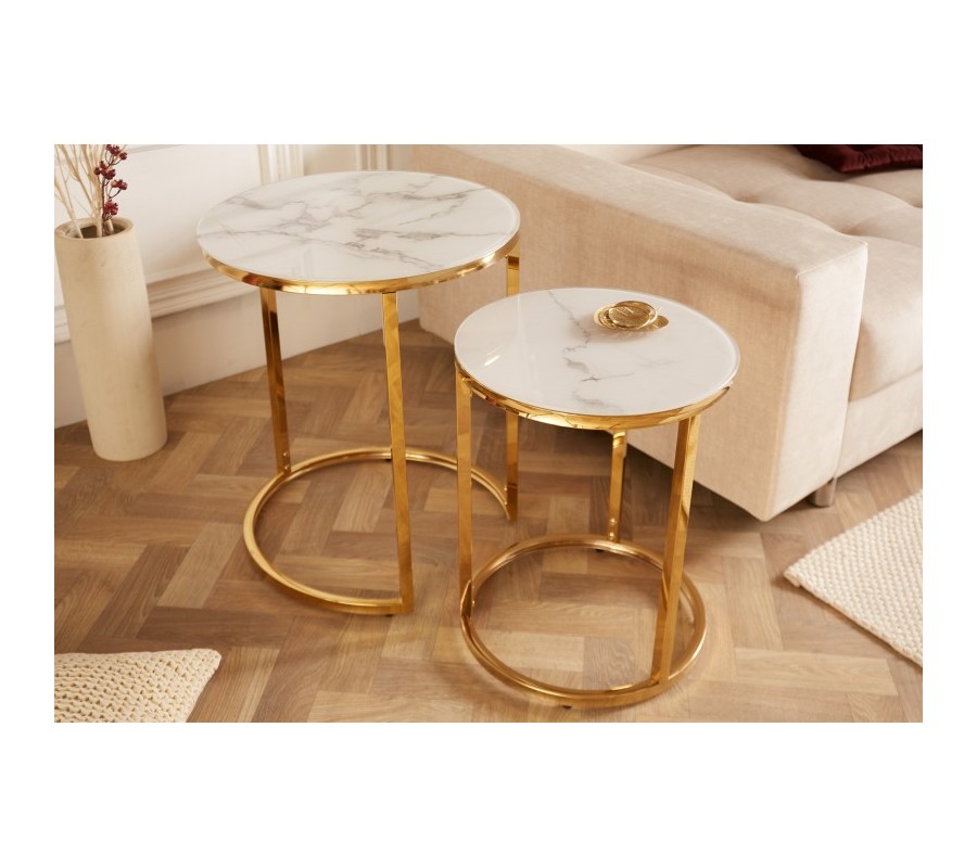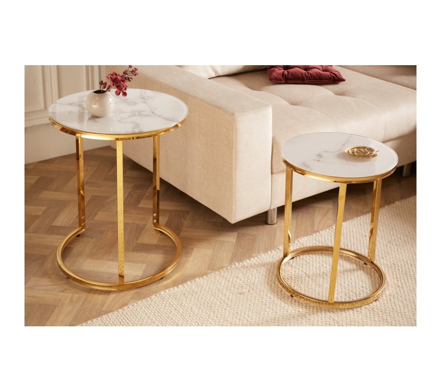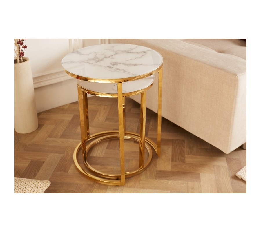 Art-deco set príručných stolíkov Gold Marbleux v modernom štýle s kovovou postavou zlatej farby s mramorovým vzhľadom 60cm