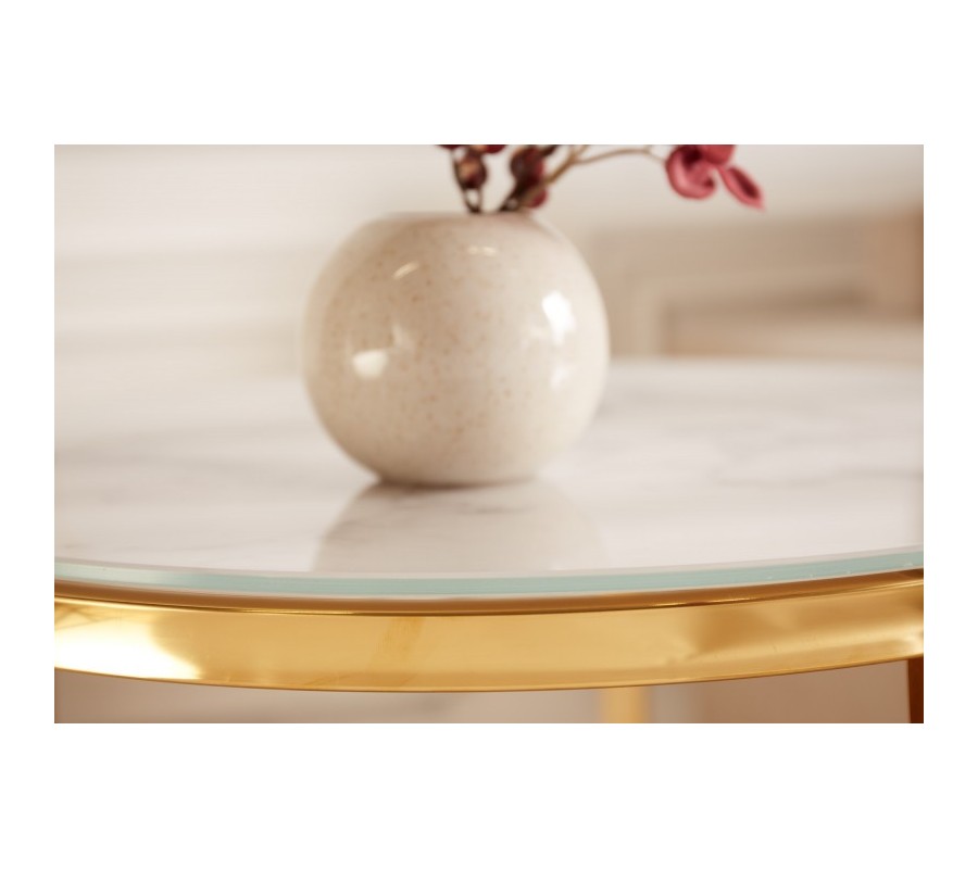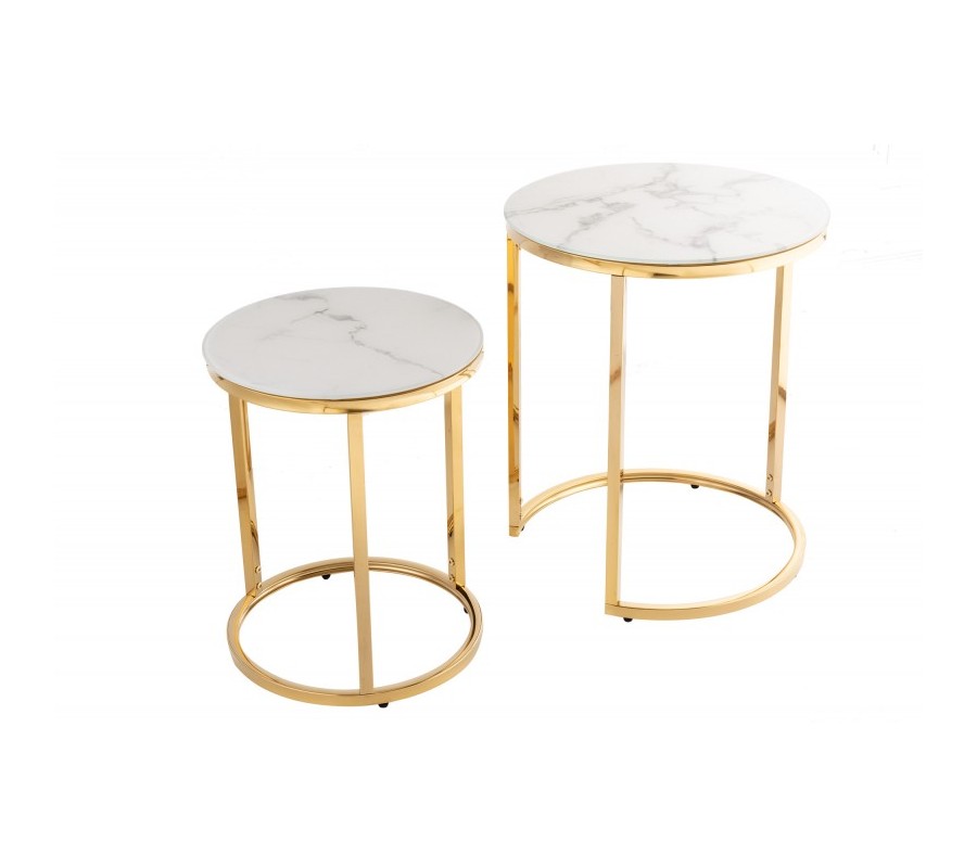 Niet lepšieho spôsobu ako doplniť jemné svetlé farby moderných obývačiek, než so setom príručných stolíkov z kolekcie Gold Marbleux. Kolekcia moderného nábytku Gold Marbleux Vám ponúka pár príručných stolíkov s okrúhlymi vrchnými doskami, ktoré sa nesú v prevedení biely mramor. Obe dosky stolíkov s hrúbkou 5 milimetrov a nosnosťou 50 kilogramov chráni kovový rám s troma nožičkami v lesklom luxusnom prevedení zlatej farby. Moderný set príručných stolíkov Gold Marbleux v luxusnom štýle odporúčame kombinovať v moderných obývačkách so zlatými farbami a bielym lesklým nábytkom, s farebnými sedačkami, kreslami a kobercami a v neposlednom rade so svetlými kovovými lampami a sklenenými závesnými lampami.