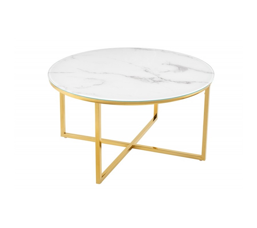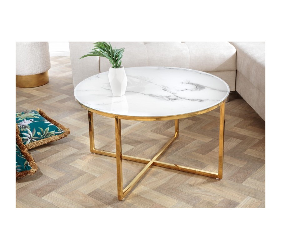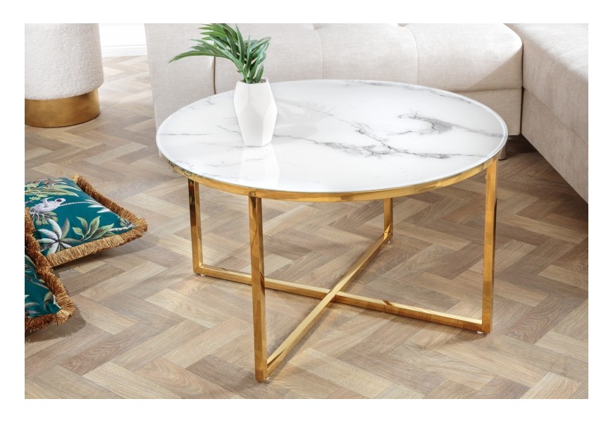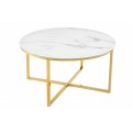 Art-deco okrúhly konferenčný stolík Gold Marbleux s bielym mramorovým vzhľadom s kovovou podstavou zlatá 80cm