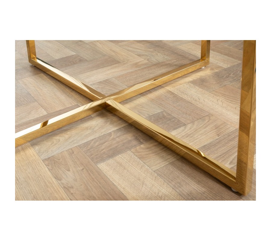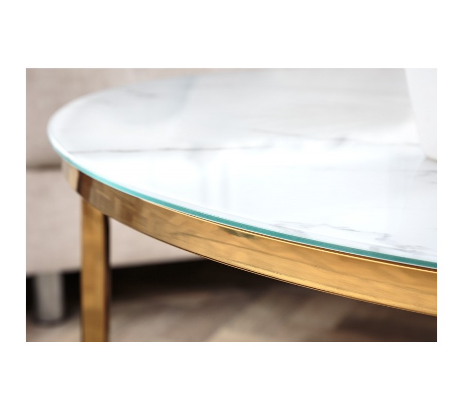 Kolekcia moderného nábytku Gold Marbleux v kovovom vyhotovení Vám ponúka nadčasový okrúhly konferenčný stolík, ktorý podčiarkne luxusný vzhľad Vašej obývačky. Moderný konferenčný stolík Gold Marbleux sa pýši unikátnym luxusným dizajnom, ktorý je dosiahnutý kombináciou mramoru a zlatej farby. Vrchná doska stolíka je vyrábaná z kvalitného 6 milimetrov hrubého bezpečnostného skla, ktoré disponuje spomenutým mramorovým vzhľadom v bielej farbe. Vrchnú dosku stolíka Gold Marbleux chráni lesklý kovový rám v zlatej farbe, ktorý taktiež formuje štyri spojené nožičky. Doska konferenčného stolíka má maximálnu nosnoť 50 kilogramov. Zlatá farba podstavy konferenčného stolíka Gold Marbleux vytvorí luxusný vzhľad vo svetlých moderných interiéroch v kombinácií s bielym nábytkom, ktorý môže byť krásne doplnený sedačkami a doplnkami so zlatými kovovými prvkami v štýle art-deco.
