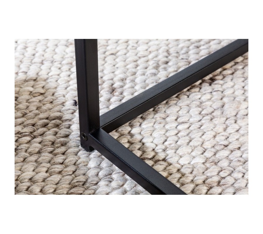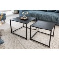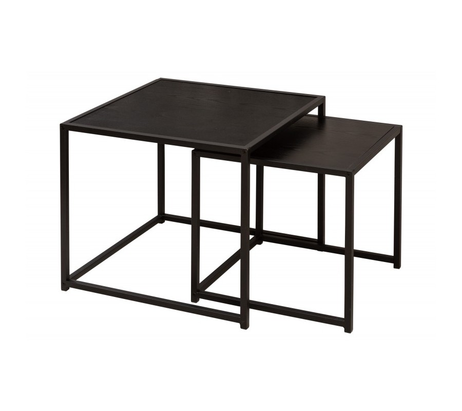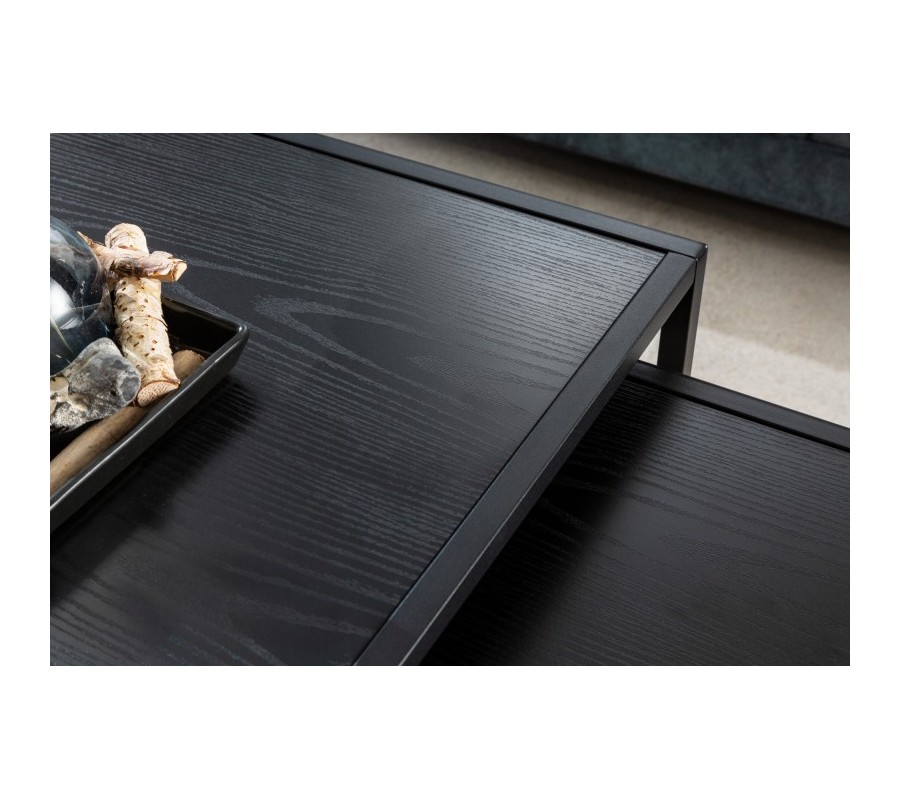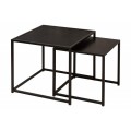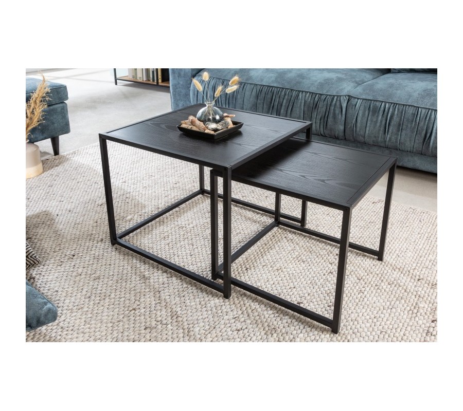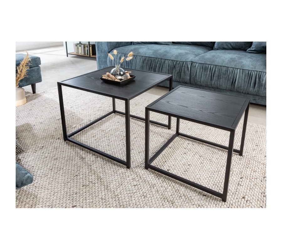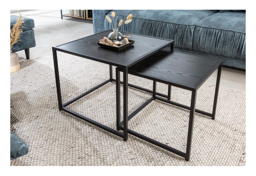 Moderný set konferenčných stolíkov z kolekcie inudstriálneho nábytku Industria Negra je štýlovým kúskom, ktorý Vás zaujme svojím elegantným čiernym dizajnom a svojou funkčnosťou. Dizajový set konferenčných stolíkov Industria Negra je vyrábaný z čierneho dreva, obohateného o kvalitného dyhovanie so vzhľadom jaseňového dreva, čo vytvorí stolíkom nádych prírodného prevedenia s viditeľnou kresbou a líniami. Vrchné dosky stolíkov sú chránené kovovým rámom so štvorcovou podstavou a štyrmi nožičkami, vďaka čomu naberá set Industria Negra minimalistický a ľahko kombinovateľný industriálny vzhľad. Vďaka svojmu prevedeniu môžete set stolíkov Industria Negra využiť ako pár konferenčných stolíkov či už spoločne, vedľa seba v tvare písmena L, alebo môžete napríklad využiť menší kúsok zo setu ako príručný stolík ku Vášmu kreslu. Industriálny vzhľad setu Industria Negra odporúčame kombinovať vo svetlých obývačkách v kombinácií s tmavo čalúnenými sedačkami, kobercami, alebo s kovovým nábytkom z kolekcie Industria Negra.