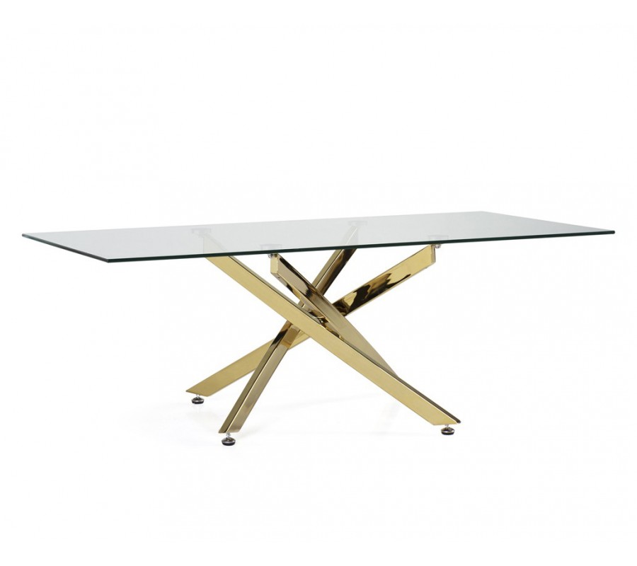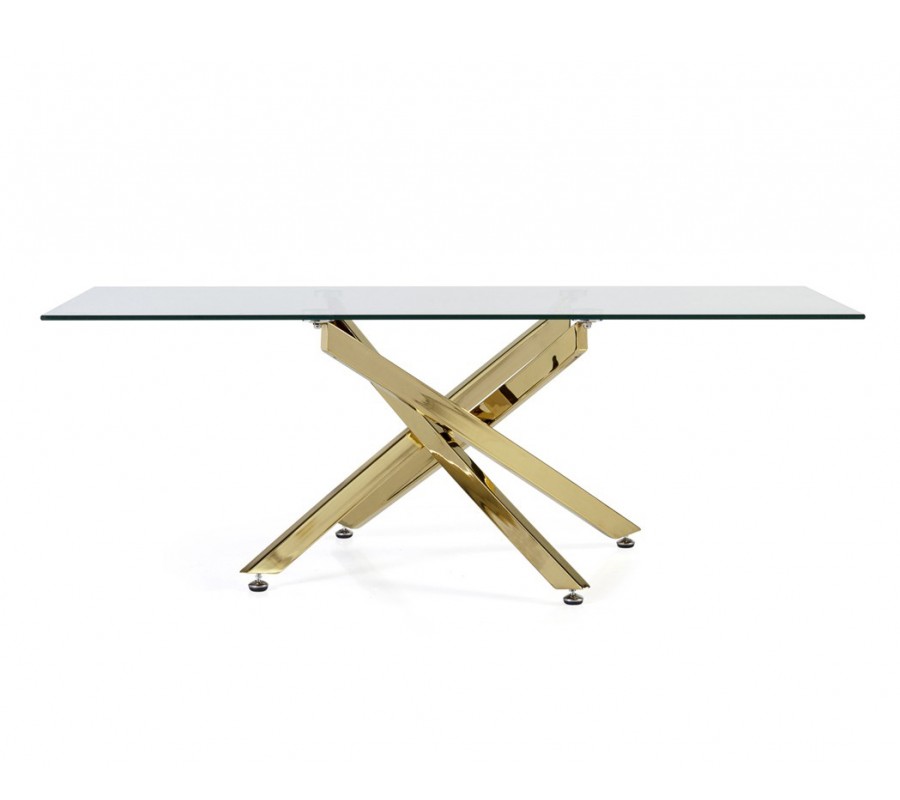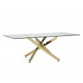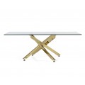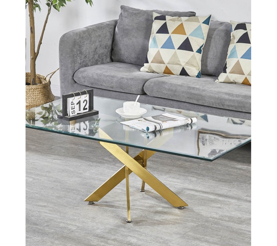 Glamour konferenčný stolík Brilia so zlatou kovovou konštrukciou a obdĺžnikovou sklenenou doskou 120cm