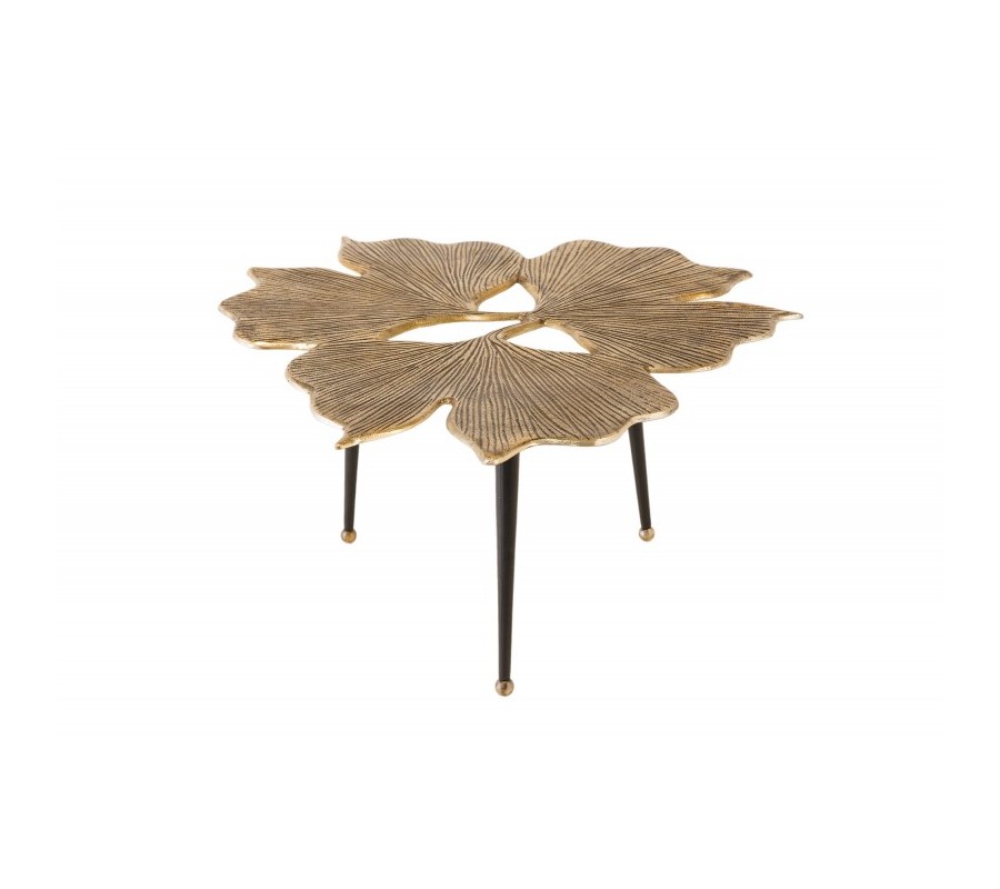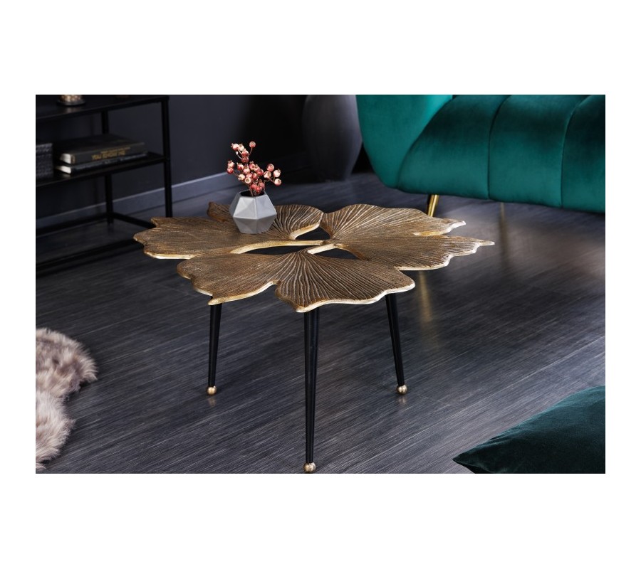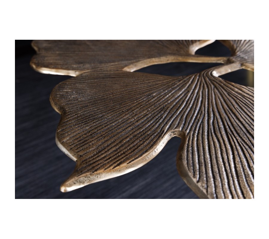 art-deco si zaručene obľúbia jedinečný konferenčný stolík Ginko, ktorý prináša nevšedný a nápaditý dizajn. Konferenčný stolík Ginko sa v prvom rade pýši unikátnym vyhotovením kovovej vrchnej dosky, ktorá sa nesie v tvare listov ginko biloba. Dizajnová vrchná doska stolíka Ginko sa taktiež môže pochváliť svojim dôrazom na detail, vďaka ktorému je vidieť štruktúru lístkov. Stabilitu konferenčného stolíka zaistia tri šikovne uložené priame kovové nožičky v čiernom prevedení. Art-deco konferenčný stolík Ginko vynikne najmä s farebnými zamatovými