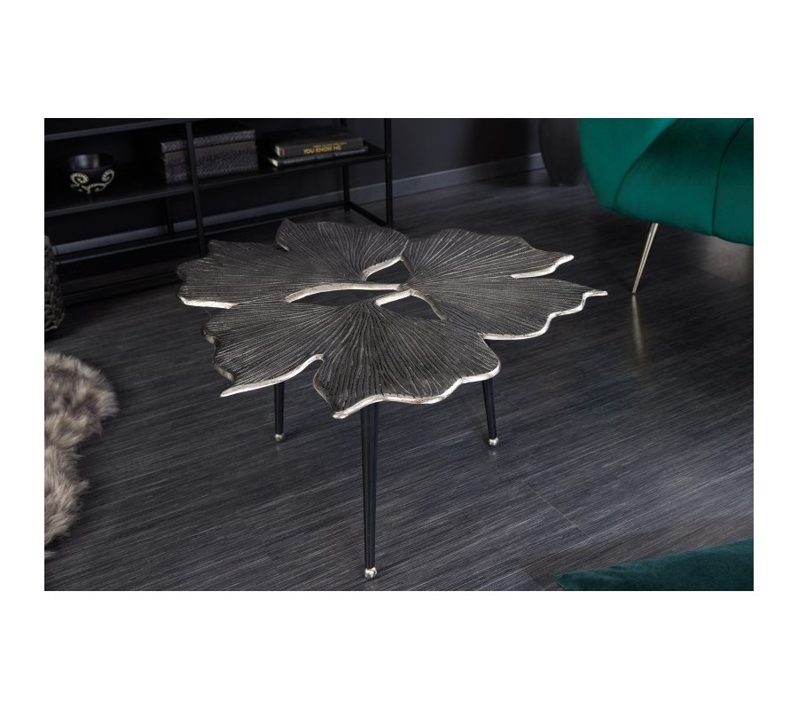 Konferenčný stolík Ginko Vás zaujme svojím jedinečným vzhľadom v tvare listu ginko, ktorý je presnou reprezentáciou toho, čo Vám dizajnový nábytok v štýle art-deco ponúka. Stolík Ginko je disponuje kovovou vrchnou doskou v sivej farbe, ktorá je postavená na troch čiernych nožičikách z kovu. Vďaka svojmu vyhotoveniu a unikátnemu tvaru sa stane dizajnový konferenčný stolík Ginko pôvabným štýlovým kúskom pre moderne a art-deco zariadené obývačky. Farebné prevedenie stolíka Ginko vynikne najmä s farebnými zamatovými sedačkami so zlatými nožičkami, s farebnými kobercami s dlhým vlasom, a taktiež s kovovými doplnkami a lampami.