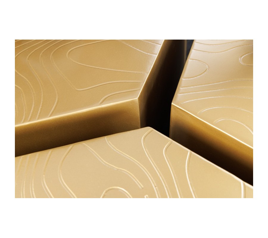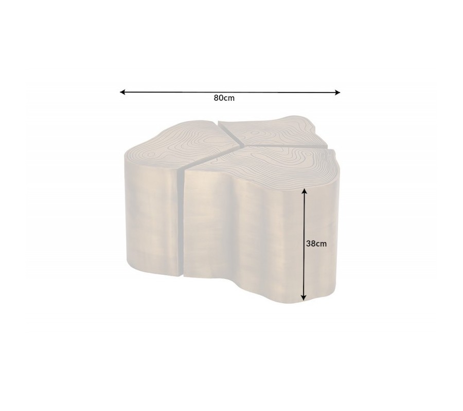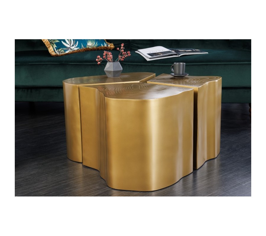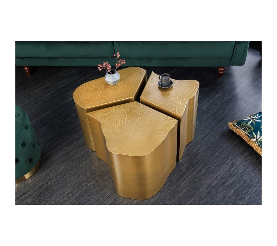 Exkluzívny dizajn konferenčného stolíku Altera poteší oko nejedného nadšenca pre dizajnové interiérové doplnky. Tento unikátny kúsok zaujme predovšetkým svojím nepravidelným asymetrickým tvarom, ktorý pozostáva z troch častí. Zaoblené organické tvary sú dozdobené jemnou lineárnou kresbou na povrchu, čo dotvára unikátny a originálny dizajn. Spojením troch jednotlivých častí vznikajú v strede stolíka škáry pripomínajúce trhliny v skale. Konštrukcia konferenčného stolíku Altera je vyrobená z kovu, vďaka čomu sa môže pýšiť výbornou stabilitou a pevnosťou. Kovový materiál dopĺňa luxusné zlaté prevedenie, ktoré rozžiari vaše priestory a nádherne vynikne v moderných, art deco a glamour ladených interiéroch. Nádherný art deco efekt dosiahnete napríklad kombináciou so zamatovou smaragdovozelenou sedačkou, sklenenými a zrkadlovými doplnkami či s dizajnovým koberčekom s vysokým vlasom!