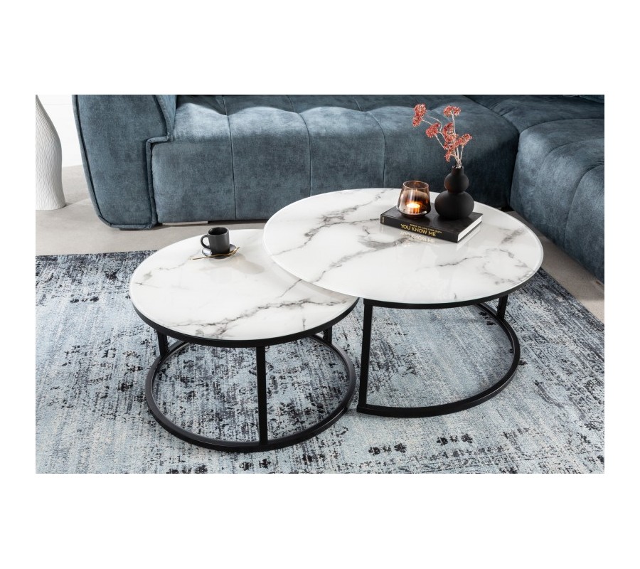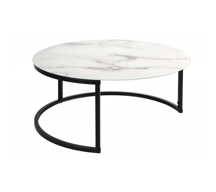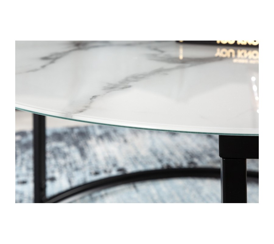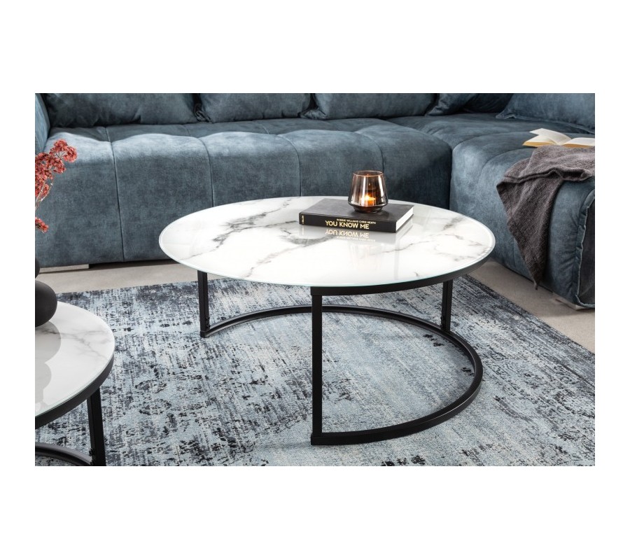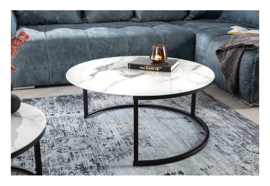 Industriálny dojem konferenčného stolíka Benjamin I sa svojimi univerzálnymi farbami a nadčasovým dizajnom nestratí v žiadnej modernej domácnosti. Mohutná a pevná konštrukcia okrúhleho tvaru dodáva stabilitu a upevňuje vrchnú dosku vyrobenú z bezpečnostného skla s mramorovým finishom v bielej farbe. Podstava bez klasických nožičiek v čiernom matnom vyhotovení kruhovitého tvaru s výrezom necháva priestor na kreativitu a možnosti pri kombinácii s inými kúskami nábytku- navyše umožní kompromis, ak bojujete s malým priestorom vo vašom interiéri. Imitácia mramoru a nestarnúca kombinácia čiernej s bielou farbou vytvárajú stavebné kamene pre zariadenie vašej obývačky či vstupnej haly ladenej do moderného a art deco štýlu, kde sa bude konferenčný stolík Benjamin II dopĺňať aj so skrinkami či kreslami s farbeným čalúnením a zlatými doplnkami v podobe nožičiek či úchytov. Výborne zapadne ako doplnok k stolíku Benjamin I s menším priemerom vrchnej dosky.